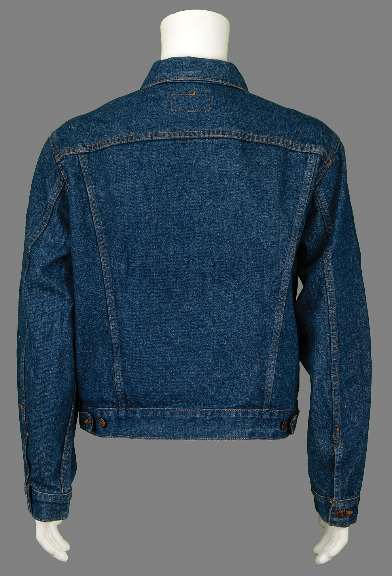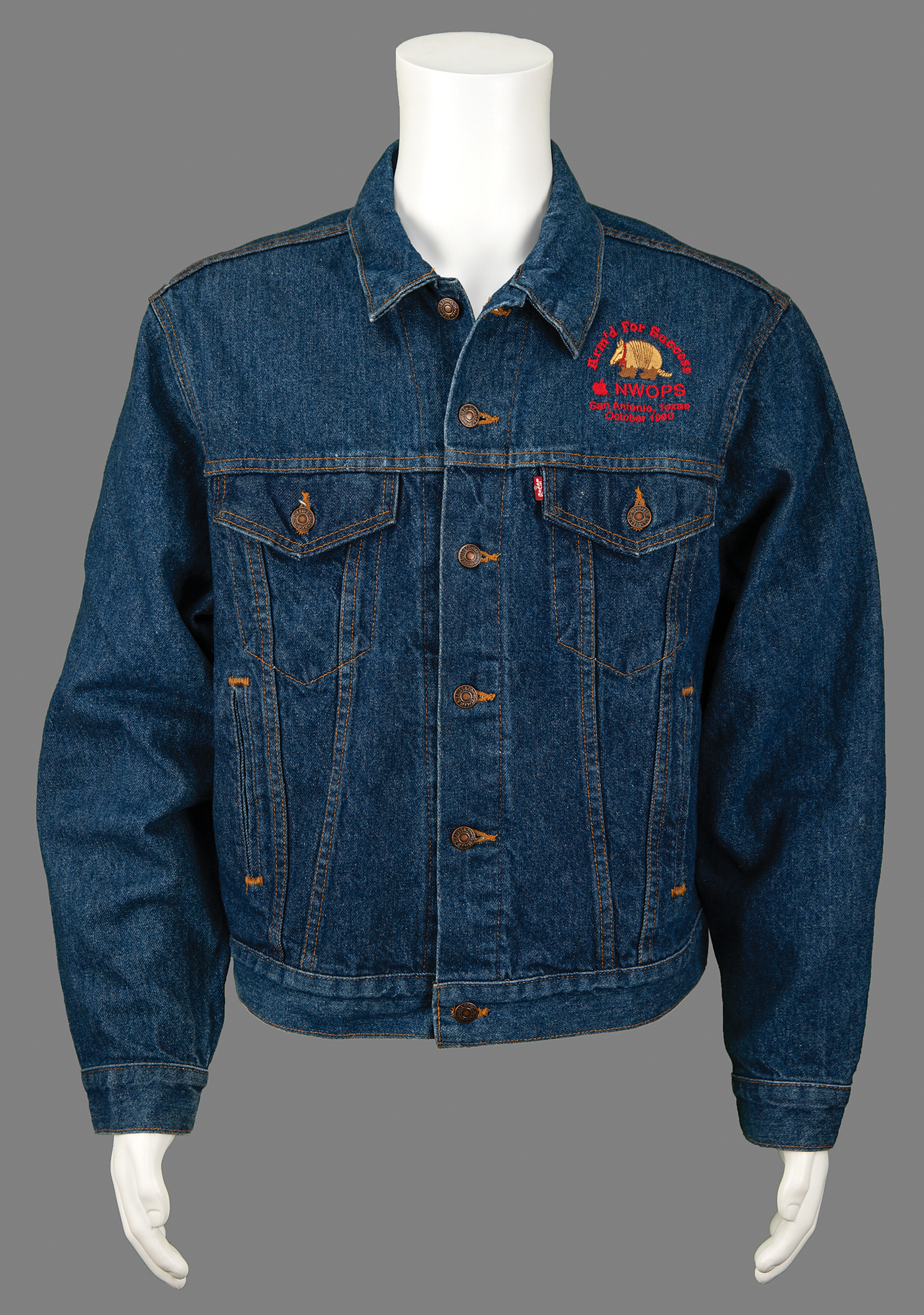 Attractive denim jacket by Levi Strauss & Co. issued to an Apple sales team member for a NWOPS conference held in San Antonio, Texas, in October 1990, size 48, with the left chest bearing an embroidered armadillo emblem with a red Apple logo and stitched text: “Arm’d for Success, NWOPS, San Antonio, Texas, October 1990.” In fine condition.