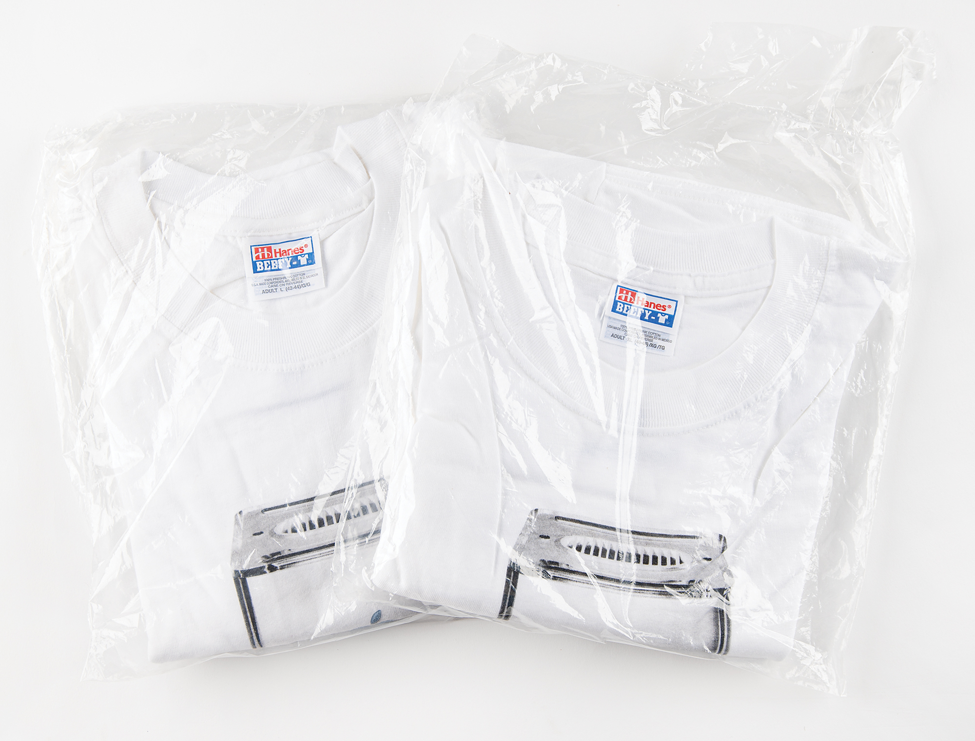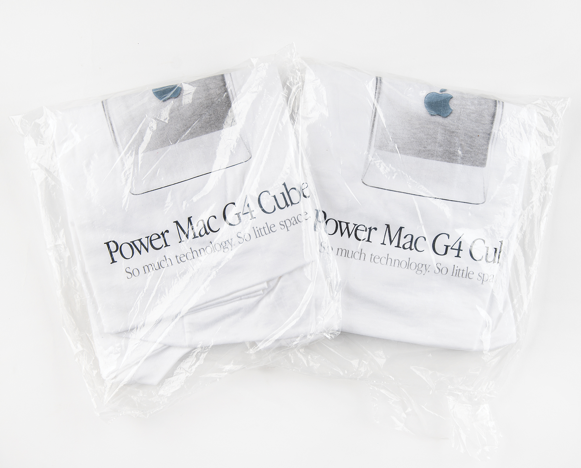 Two unopened white Apple Computer t-shirts for the Power Mac G4 Cube, size large and extra large, the fronts of both featuring an image of the computer above black and gray text: “Power Mac G4 Cube. So much technology. So little space.” In brand new, factory-sealed condition.