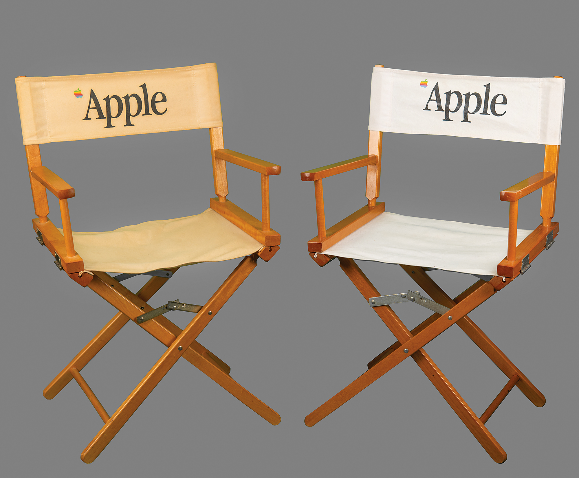 Two wooden Apple Computer director’s chairs that were available from the company’s catalog in the 1980s. The chairs, both 34˝ in height, consist of a lacquered hardwood frame with 18-ounce heavyweight canvas to the seat and back, with the latter featuring the Apple rainbow logo and company name. In overall fine condition, with a few light stains.