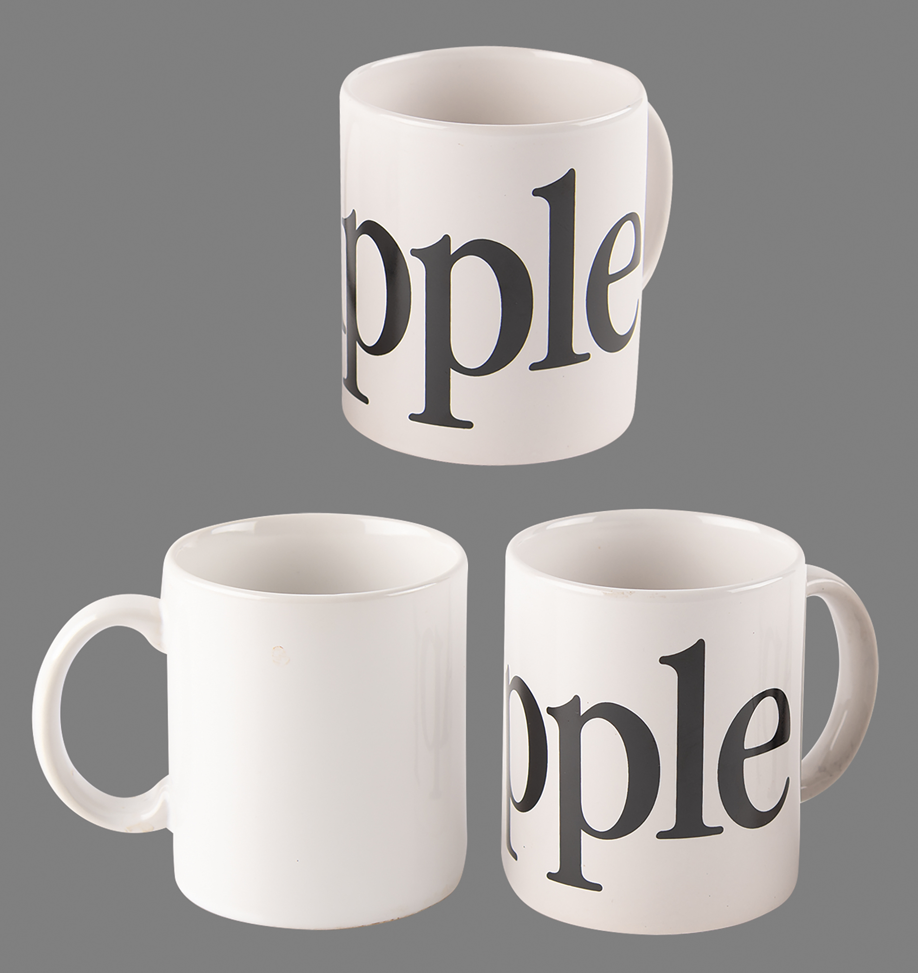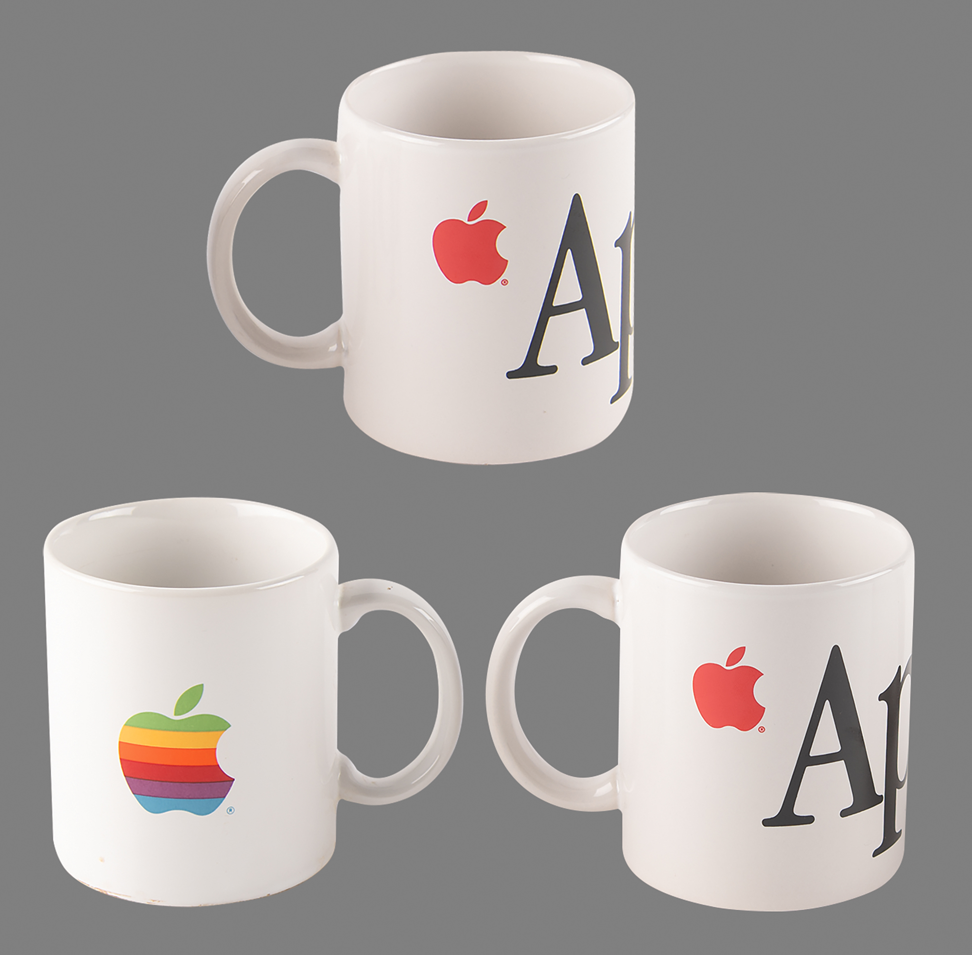 Three white Apple Computer ceramic coffee mugs, with two featuring a small red Apple logo and large black lettering, “Apple,” and the third simply bearing the Apple rainbow logo. In overall fine condition.