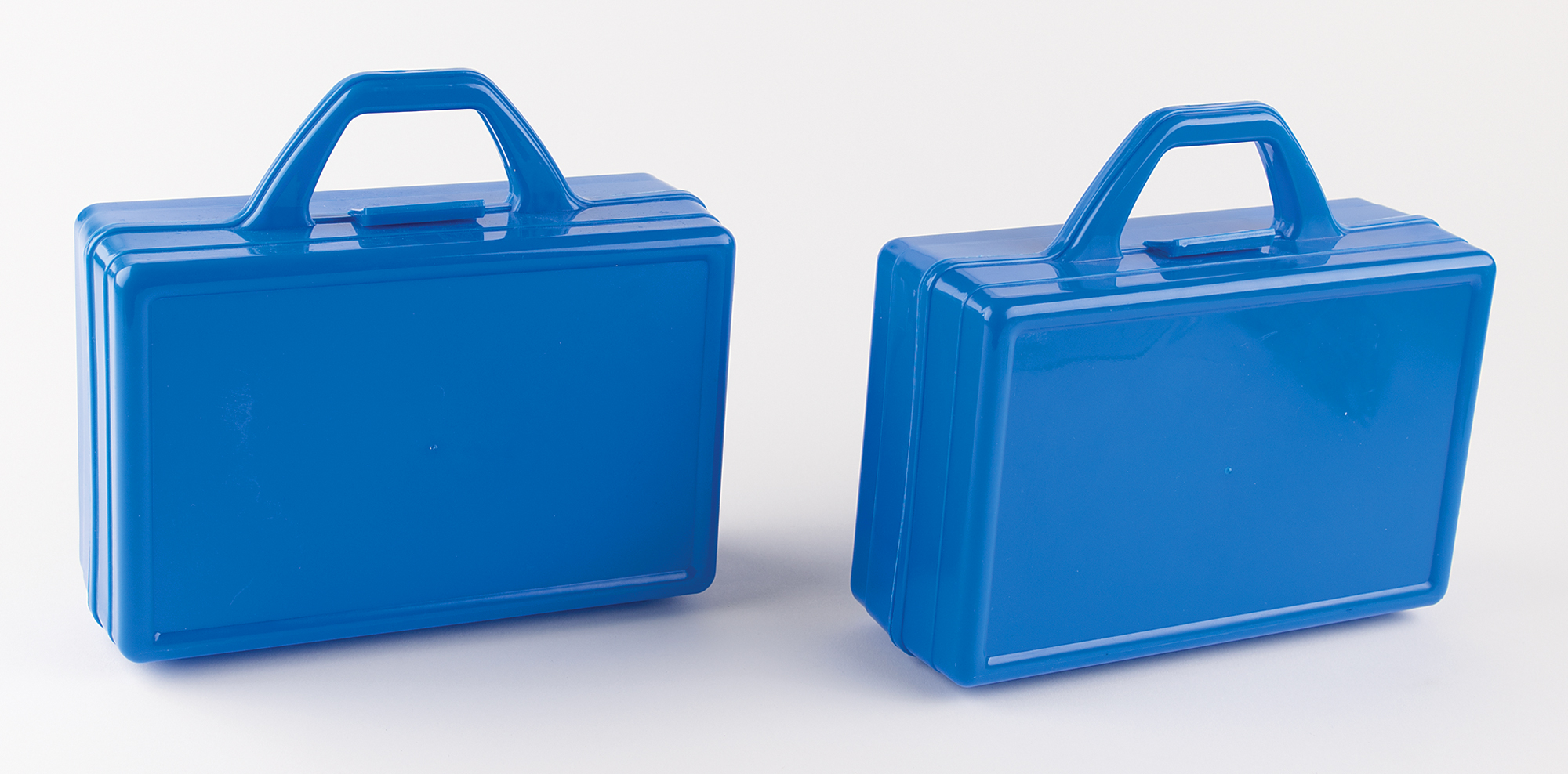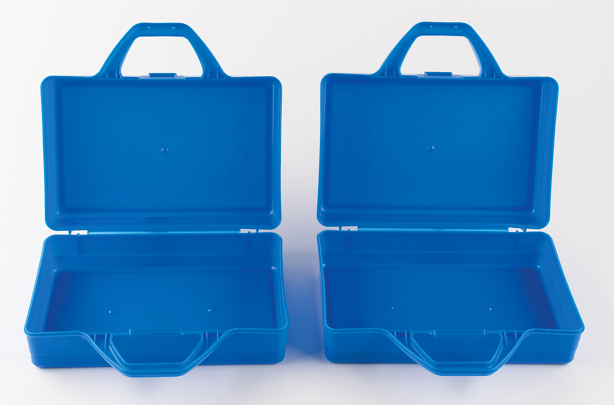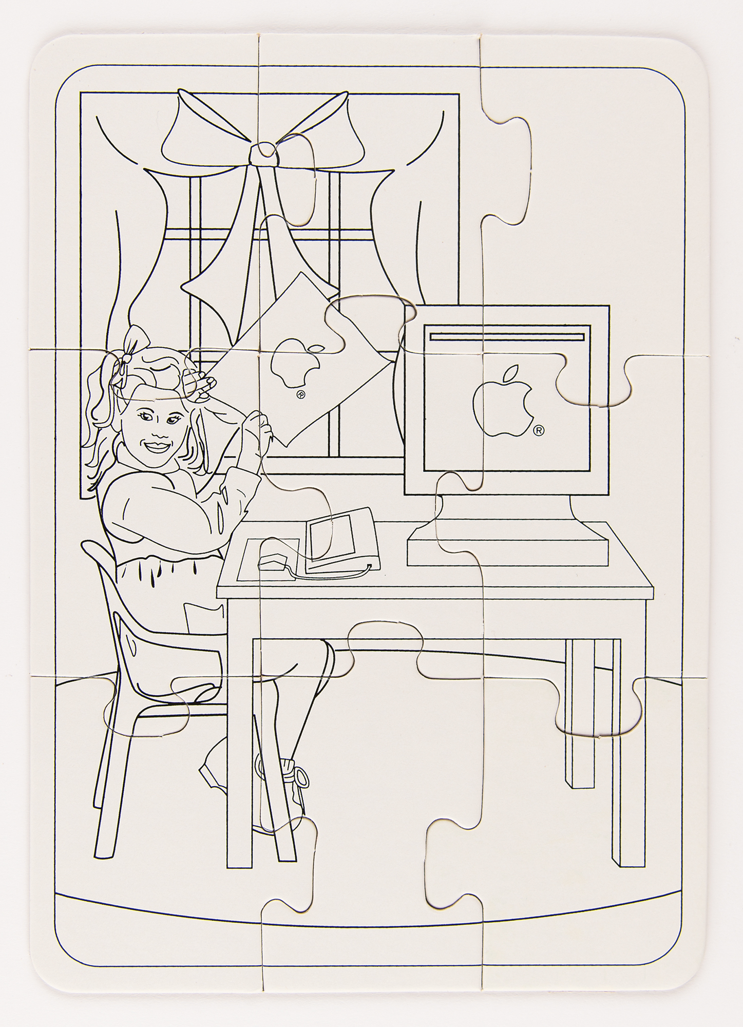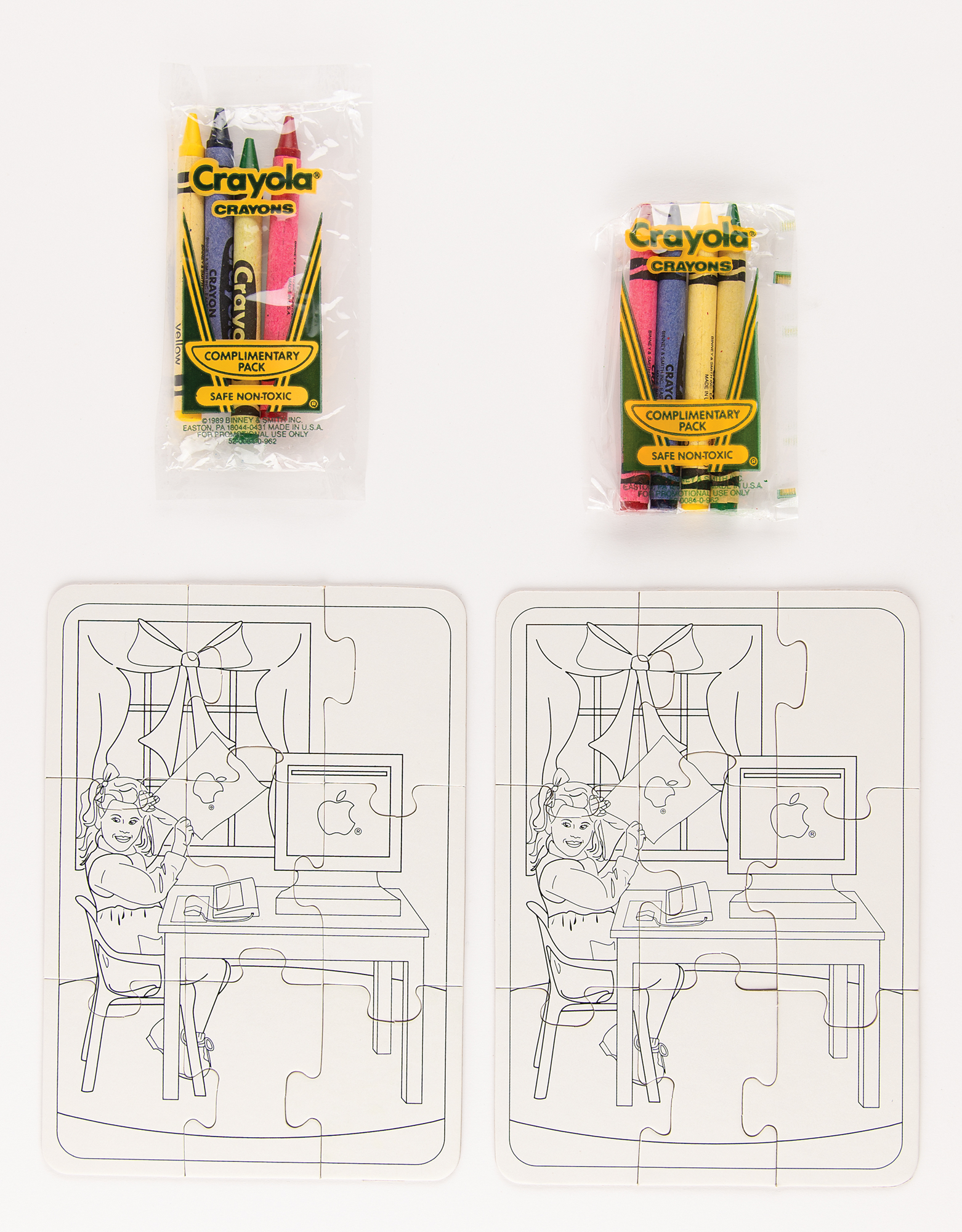 Uncommon pair of matching Apple Computer coloring kits, consisting of two blue plastic lunchbox-style cases with an Apple rainbow logo on the front, and the inside of both containing a 4-pack of Crayons and a 9-piece puzzle that, when assembled, shows a young girl seated at a table with an Apple computer. In overall fine condition.