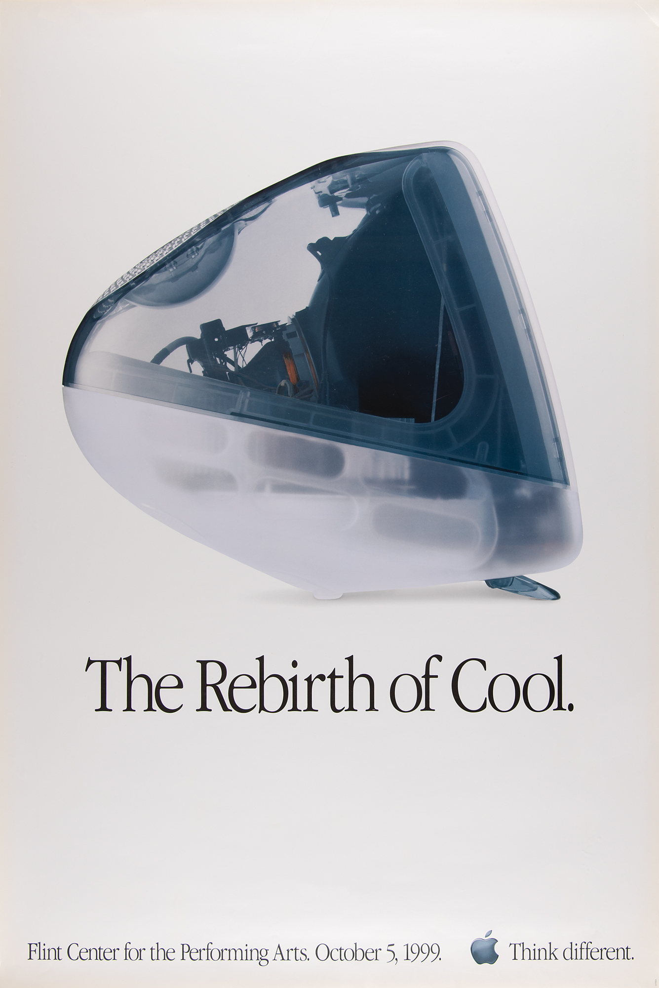 Uncommon original color 24 x 36 poster advertising the introduction of the iMac G3 at the Flint Center for the Performing Arts in Cupertino, California, on October 5, 1999, featuring a profile image of the translucent 'graphite' version of the desktop computer with text below: "The Rebirth of Cool." The bottom features Apple's logo in graphite, with the brand's famous slogan, "Think different,” and event information. Rolled and in fine condition, with light edge toning and a nearly complete tear to the upper right corner tip.