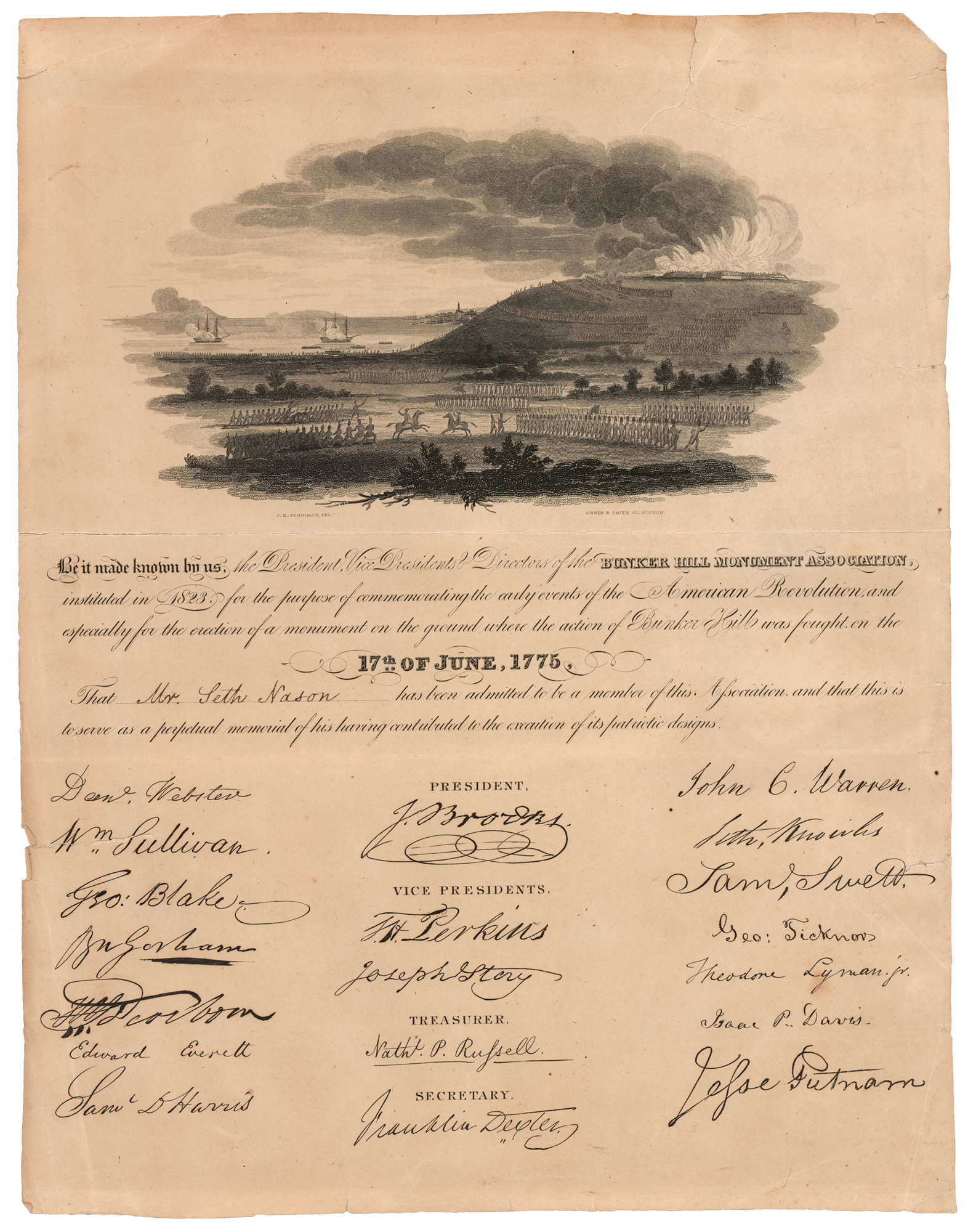 Attractive engraved 10 x 13 certificate featuring a handsome vignette of the Battle of Bunker Hill, with text below reading: "Be it made known by us, the President, Vice Presidents & Directors of the Bunker Hill Monument Association, instituted in 1823 for the purpose of commemorating the early events of the American Revolution, and especially for the erection of a monument on the ground where the action of Bunker Hill was fought on the 17th of June, 1775, That Mr. Seth Nason has been admitted to be a member of this Association and that this is to serve as a perpetual memory of his having contributed to the execution of its patriotic designs." Below are the facsimile signatures of the organization's officials, including John Brooks, Joseph Story, Daniel Webster, Edward Everett, Thomas H. Perkins, George Ticknor, and others. In very good condition, with edge tears and fold separation, some of which has been archivally repaired.