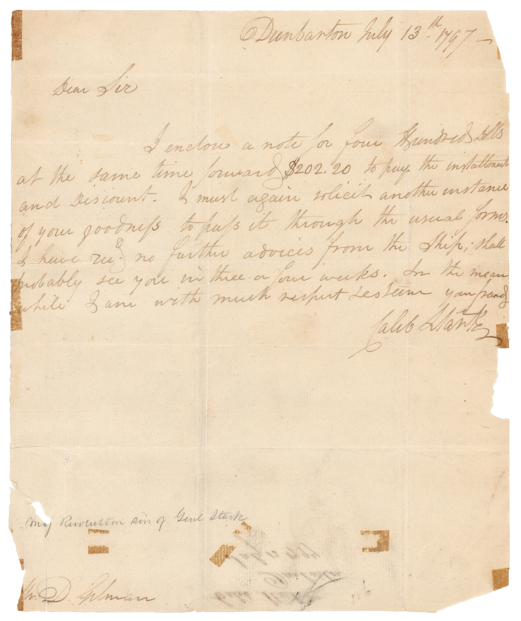 Eldest son (1759–1838) of General John Stark and his wife Molly Stark, who served with his father in the 1st New Hampshire Regiment at the Battle of Bunker Hill, Trenton, and Princeton. ALS, one page, 7.25 x 8.75, July 13, 1797. Handwritten letter to "Mr. D. Gilman," in part: "I enclose a note for four Hundred Dolls. at the same time forward $202.20 to pay the installment and discount. I must again solicit another instance of your goodness to pass through the usual forms. I have rec'd no further advices from the Ship; shall probably see you in three or four weeks." In very good condition, with scattered old tape stains, edge tears, and minor edge loss.