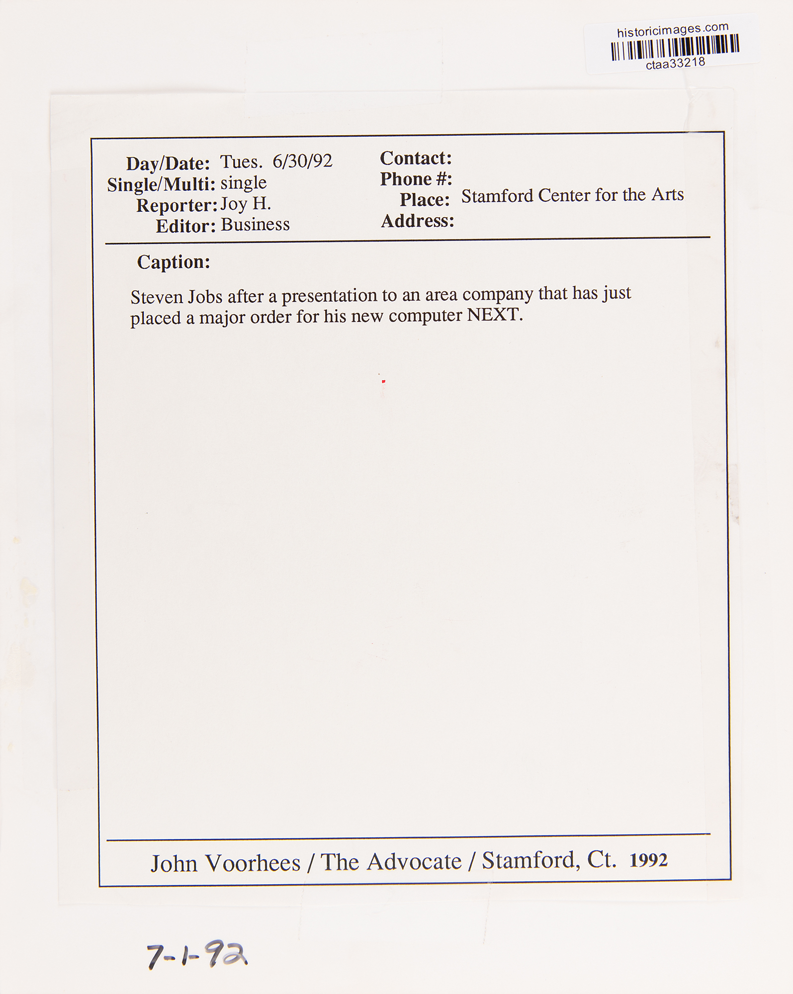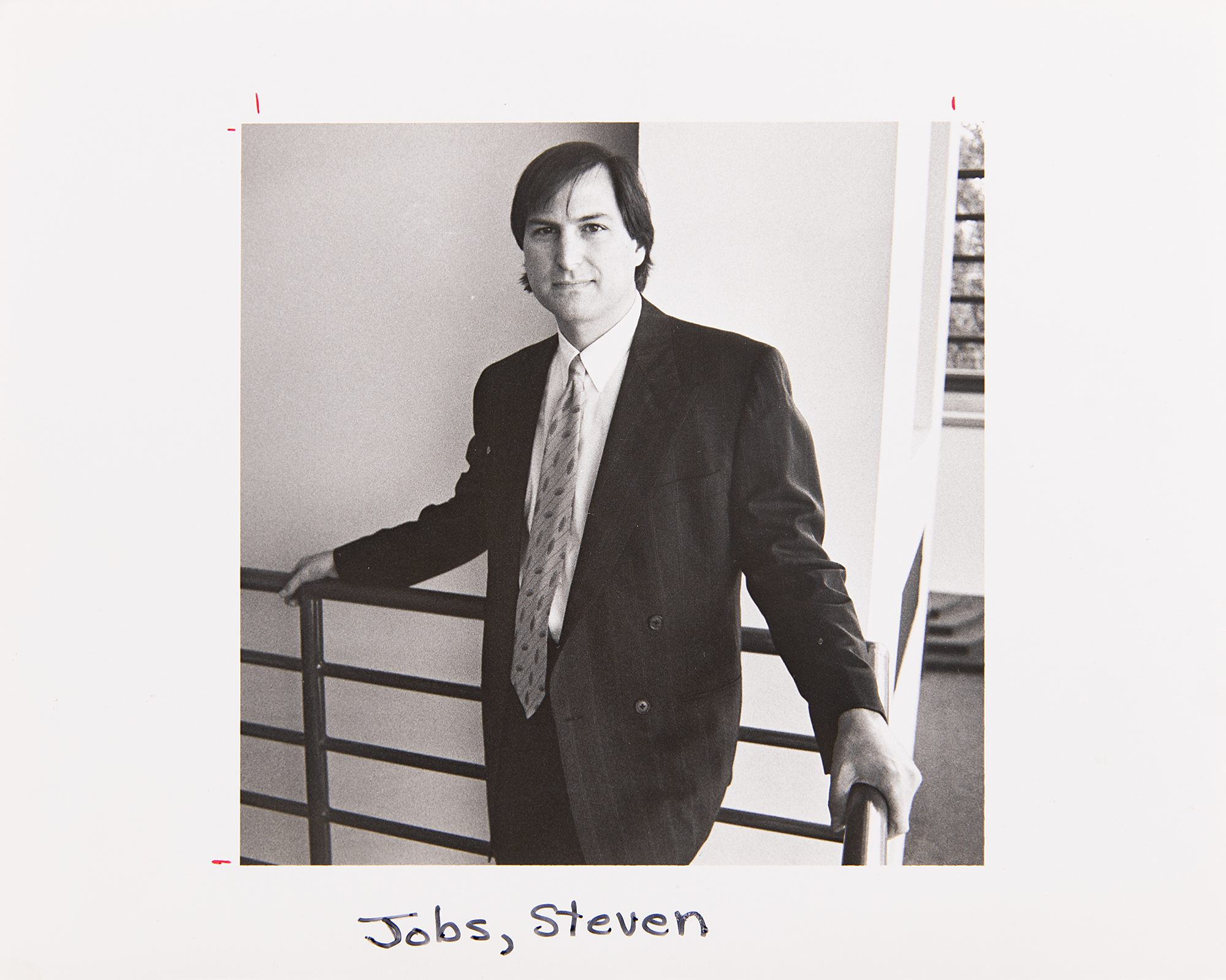 Original satin-finish 10 x 8 press photo of Steve Jobs in a handsome half-length pose, showing the NeXT CEO at the Stamford Center for the Arts in the summer of 1992, with the lower border annotated in black felt tip by an editorial hand, “Jobs, Steven.” The front bears a few editorial marks in red ink, and the reverse bears an affixed information sheet from The Advocate newspaper of Stamford, Connecticut, which dates the photo to June 30, 1992, with the caption: “Steven Jobs after a presentation to an area company that has just placed a major order for his new computer NEXT.” The image is credited to staff photographer John Voorhees. In fine condition.