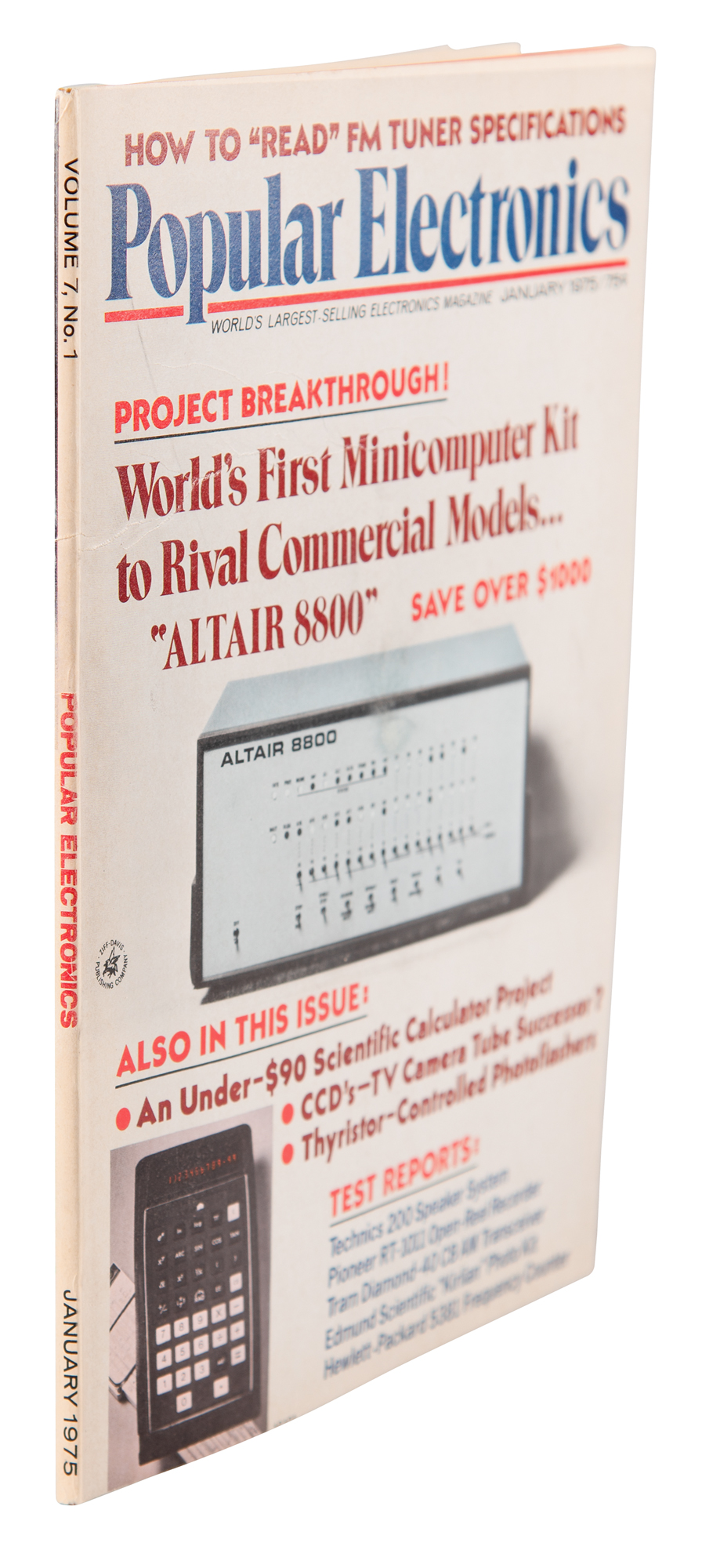 Classic issue of Popular Electronics magazine from January 1975, Volume 7, No. 1, 112 pages, 8.25 x 11, with the iconic front cover picturing the ​​Altair 8800 microcomputer, with lead article text reading: “Project Breakthrough! World’s First Minicomputer Kit to Rival Commercial Models…‘ALTAIR 8800,’ Save over $1000.” The related article by H. Edward Roberts and Williams Yates, entitled “ALTAIR 8800 MINICOMPUTER, PART I, The most powerful minicomputer project ever presented—for under $400,” runs from page 33 to page 38 and contains comprehensive technical information on the Altair 8800, including figures, a parts list, and the machine’s various applications. In fine condition, with light creasing to front cover, and two faint scratches to the back cover. This issue of Popular Electronics proved hugely important to the success of the Altair 8800 and to the home computer revolution.
