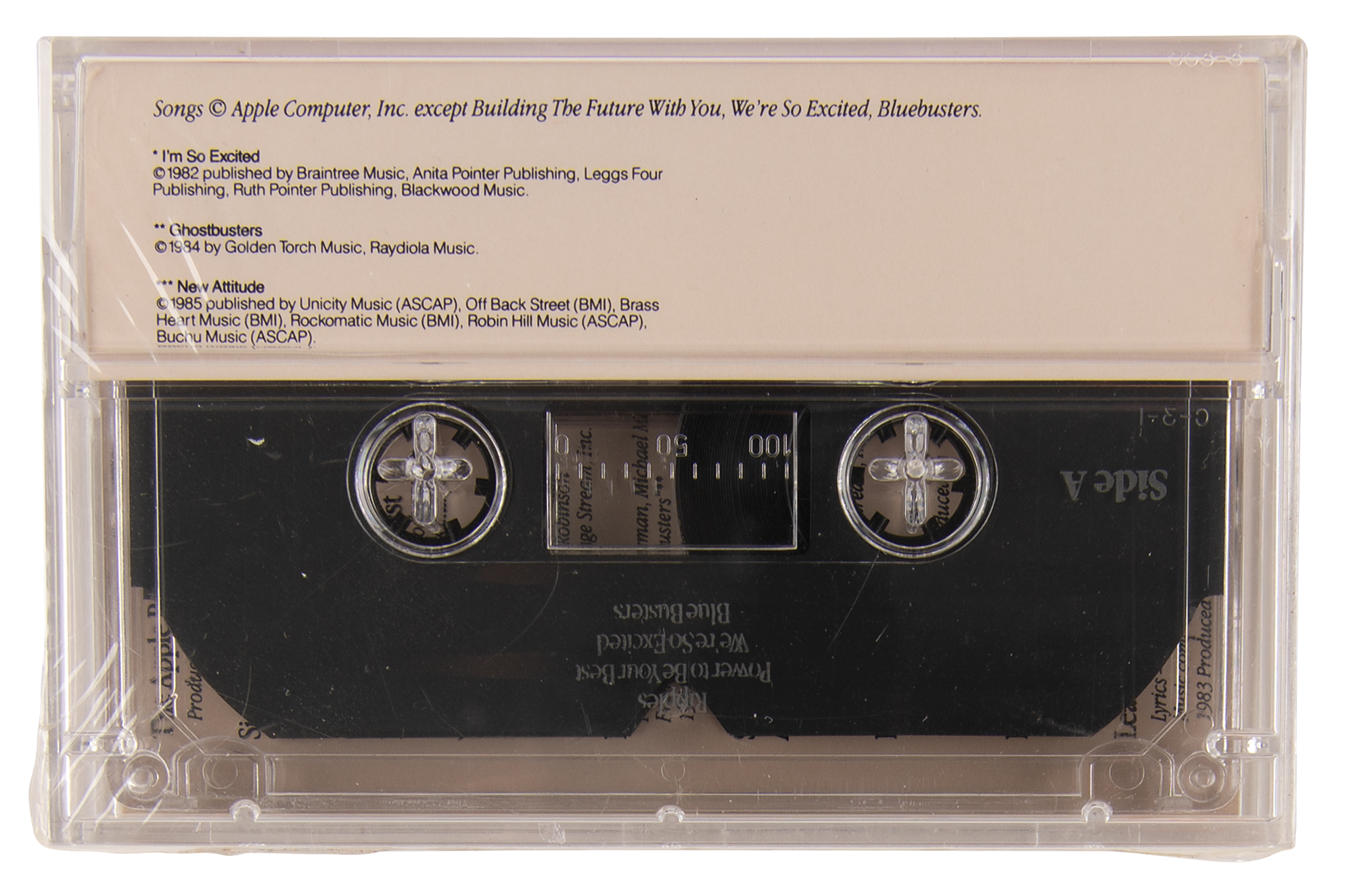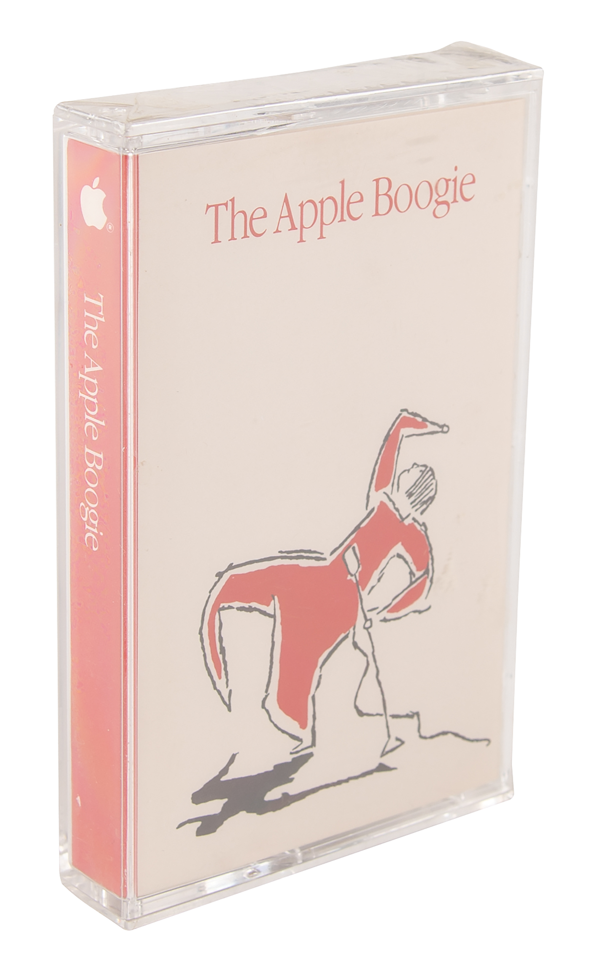 Rare unopened cassette tape of ‘The Apple Boogie’ released in 1987 by Apple Computer, Inc. The tape contains a total of eight songs: Side A - ‘Ripples,’ ‘Power to Be Your Best,’ ‘We’re So Excited,’ and ‘Blue Busters’; and Side B - ‘Apple II Forever,’ ‘Breaking Through,’ ‘Building the Future with You,’ and ‘Leading the Way.’ The most famous track is ‘Blue Busters,’ a parody of the Ghost Busters theme song, which was accompanied by a music video prepared for the company’s 1984 International Sales Meeting. The song targeted its major rival at the time, IBM, whose nickname is ‘Big Blue.’ In brand new, factory-sealed condition.