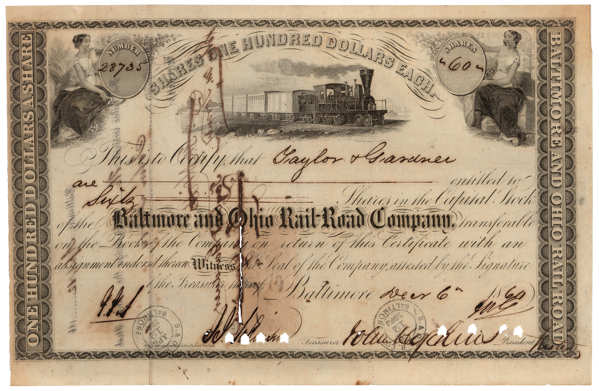 American entrepreneur, abolitionist, and philanthropist (1795–1873) whose legacy lives on in numerous foundations and institutions, such as Johns Hopkins Hospital and Johns Hopkins University. Partly-printed DS, one page, 9.75 x 6.25, December 6, 1860. Stock certificate for 60 shares in the Baltimore and Ohio Rail-Road Company issued to Taylor & Gardner, signed at the conclusion by Johns Hopkins as the company's president. The certificate features a handsome vignette of a locomotive. In fine condition, with areas of ink erosion, and the usual cancellation holes touching the signature (but affecting it less than usual).