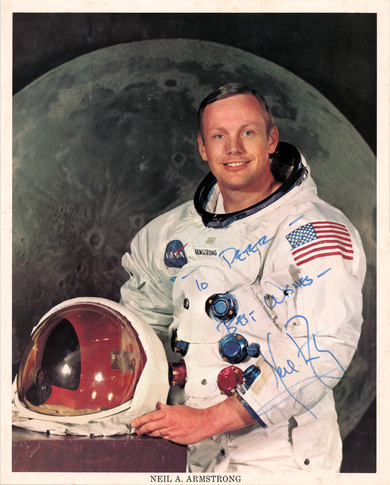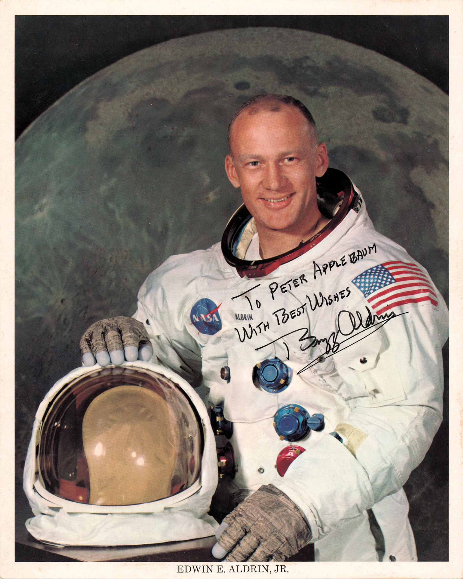 Three official color 8 x 10 NASA lithographs of the Apollo 11 crew members posing in their white space suits against a lunar backdrop, individually signed and inscribed in black or blue felt tip: “To Peter – Best wishes – Neil Armstrong,” “To Peter Applebaum, with best wishes, Buzz Aldrin,” and “M. Collins.” In overall fine condition, with small background creases to Armstrong, and a light corner bend to Aldrin.