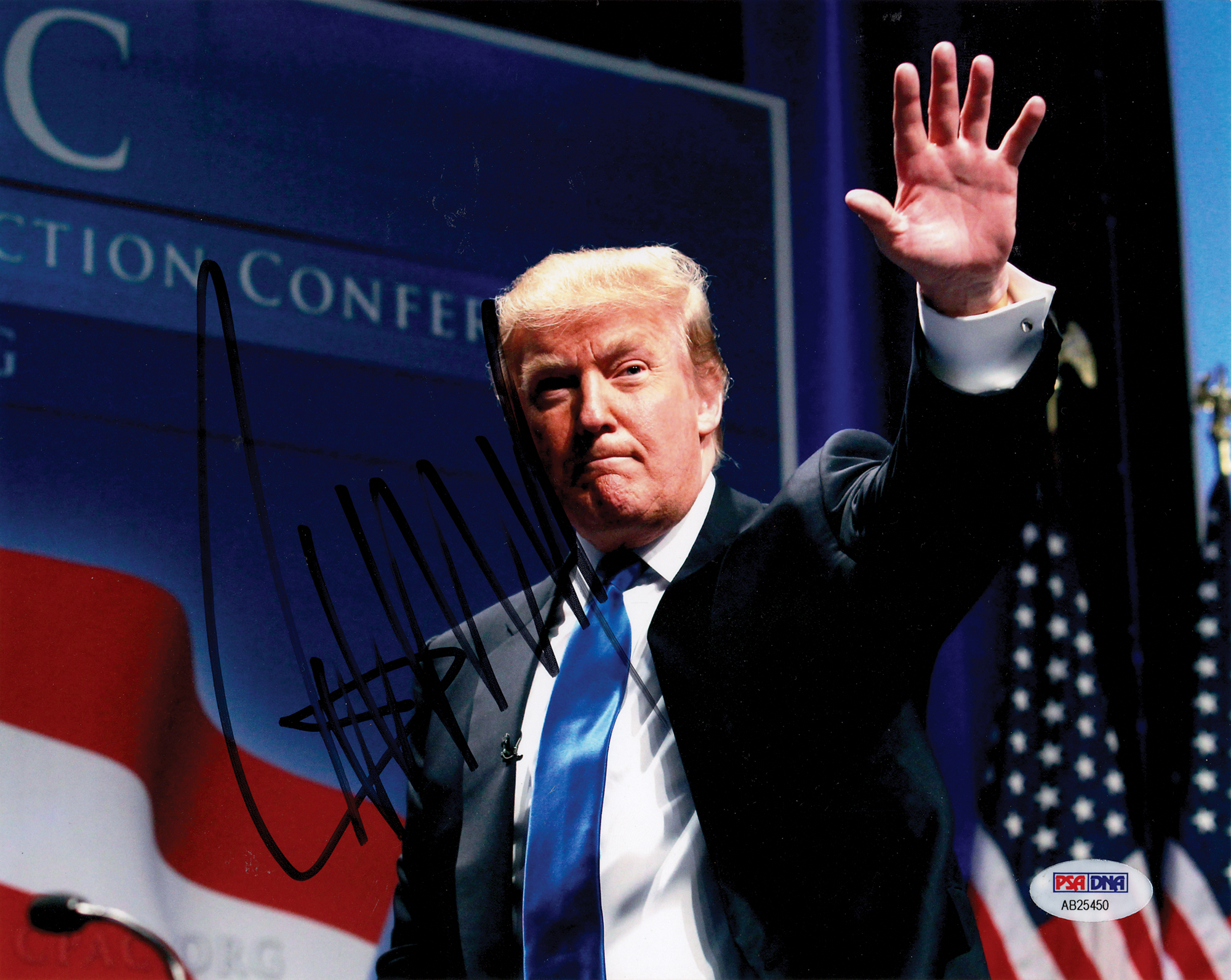 Color satin-finish 10 x 8 photo of Donald Trump waving to a crowd, signed in black felt tip. In fine condition, with a PSA/DNA authentication label affixed to the lower right corner. Accompanied by a certificate of authenticity from PSA/DNA.