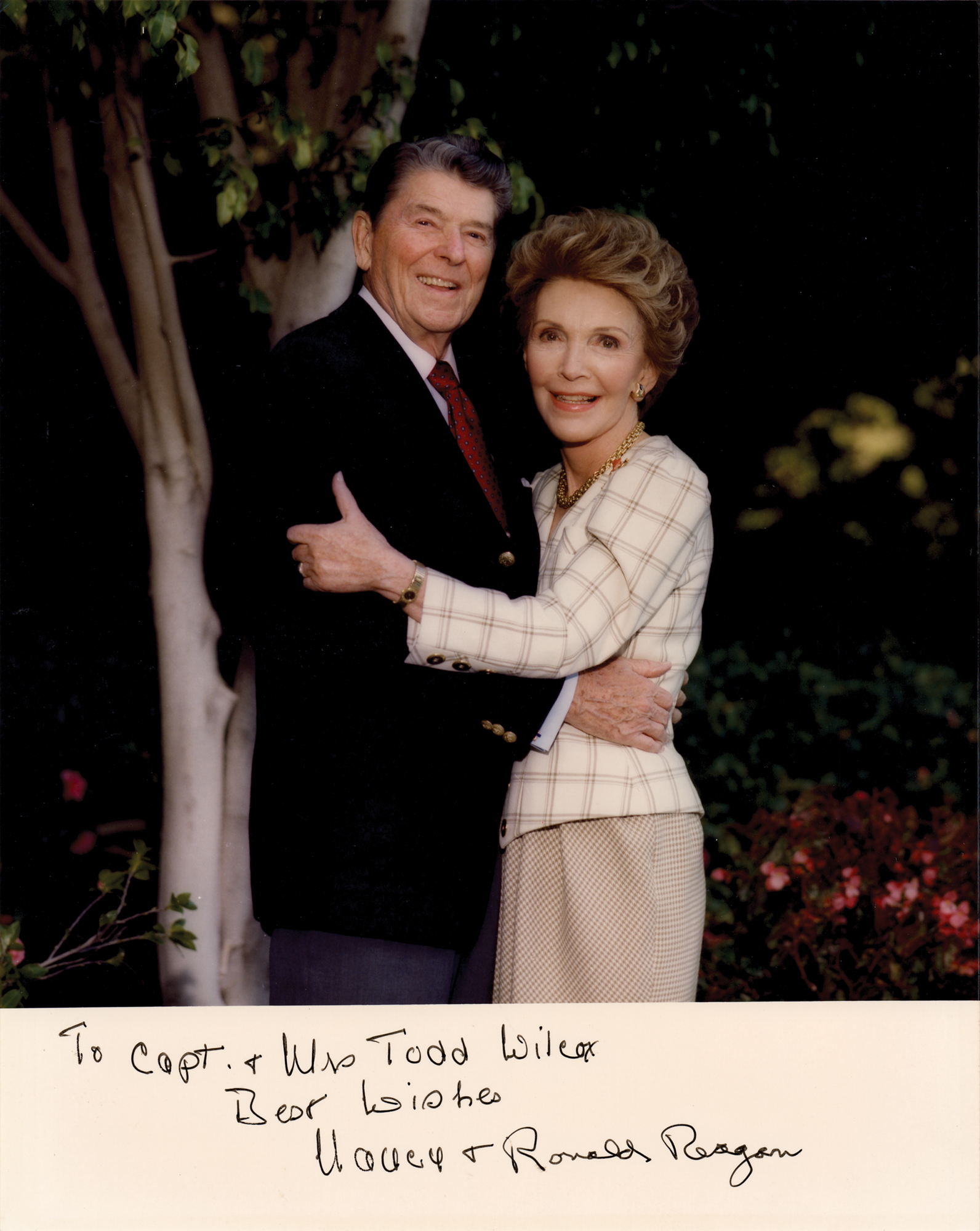 Color satin-finish 8 x 10 photo of the Reagans posing in an embrace, signed and inscribed on the lower border in black felt tip, "To Capt. & Mrs. Todd Wilcox, Best Wishes, Nancy &" and "Ronald Reagan.” In fine condition.