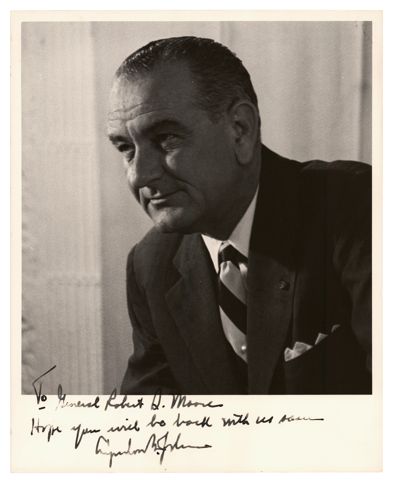 Vintage matte-finish 8 x 10 photo in a head-and-shoulders portrait, signed and inscribed in fountain pen, "To General Robert S. Moore, Hope you will be back with us soon, Lyndon B. Johnson.” In fine condition, with light edge rippling, and a faint paperclip impression to the top edge.