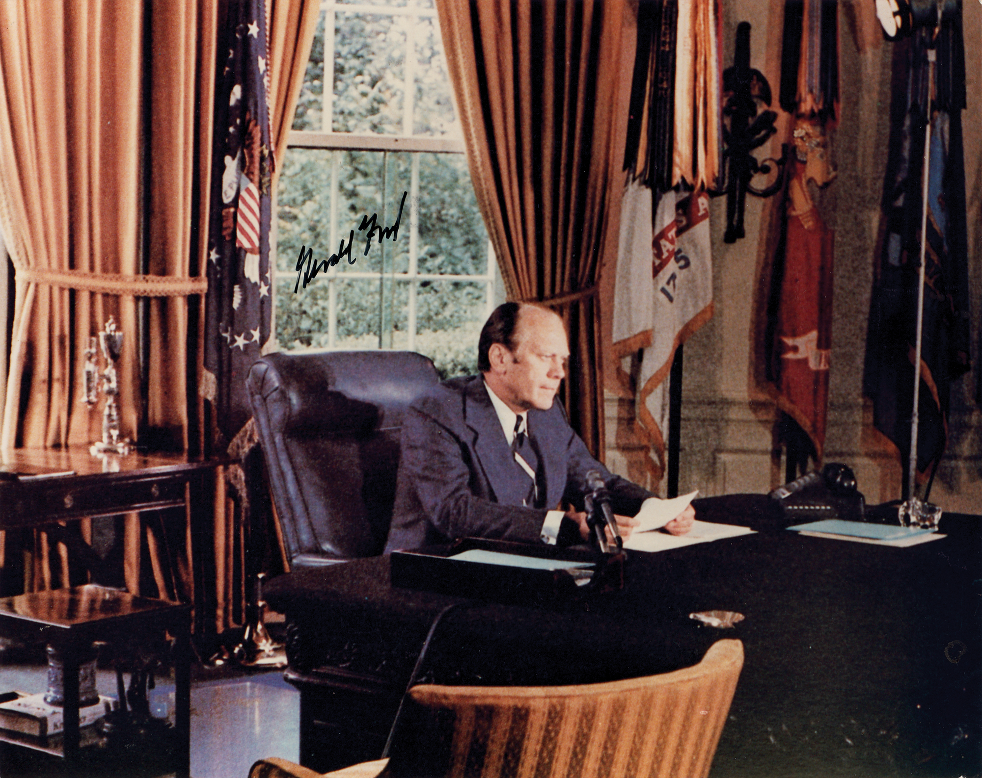 Color glossy 10 x 8 photo of Gerald Ford seated at his Oval Office desk, signed in black felt tip. In fine condition, with small creases to the lower left corner.