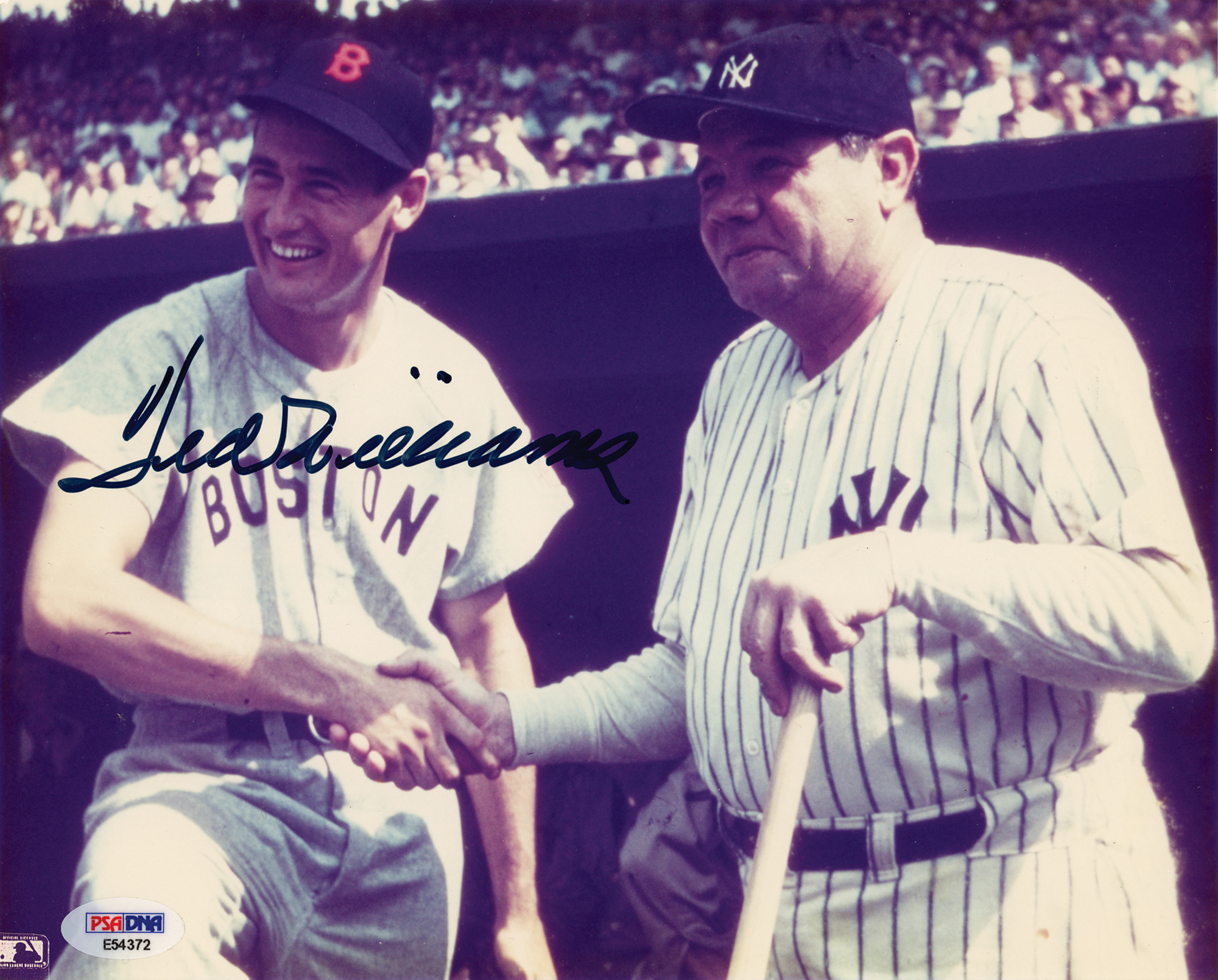 Glossy 10 x 8 photo of Ted Williams shaking hands with baseball legend Babe Ruth, signed in black felt tip. In fine condition, with a PSA/DNA authentication label affixed to the lower left corner.