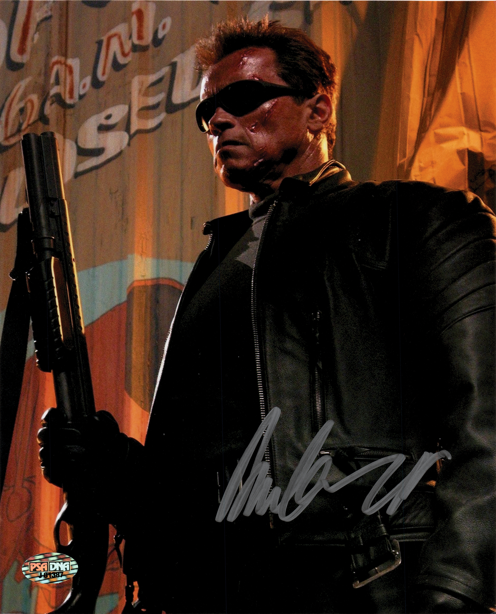 Color satin-finish 8 x 10 photo of Arnold Schwarzenegger as the title character from the Terminator franchise, signed in silver felt tip. In fine condition, with a PSA/DNA label affixed to the lower left corner. Accompanied by a certificate of authenticity from PSA/DNA.