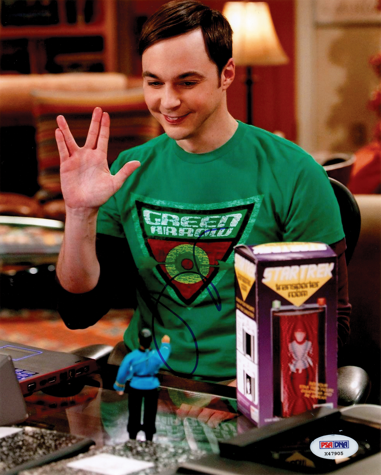 Color satin-finish 8 x 10 photo of Jim Parsons as Sheldon Cooper from The Big Bang Theory giving the Vulcan salute, signed in blue felt tip. In fine condition, with a PSA/DNA authentication label affixed to the lower right corner. Accompanied by a certificate of authenticity from PSA/DNA.