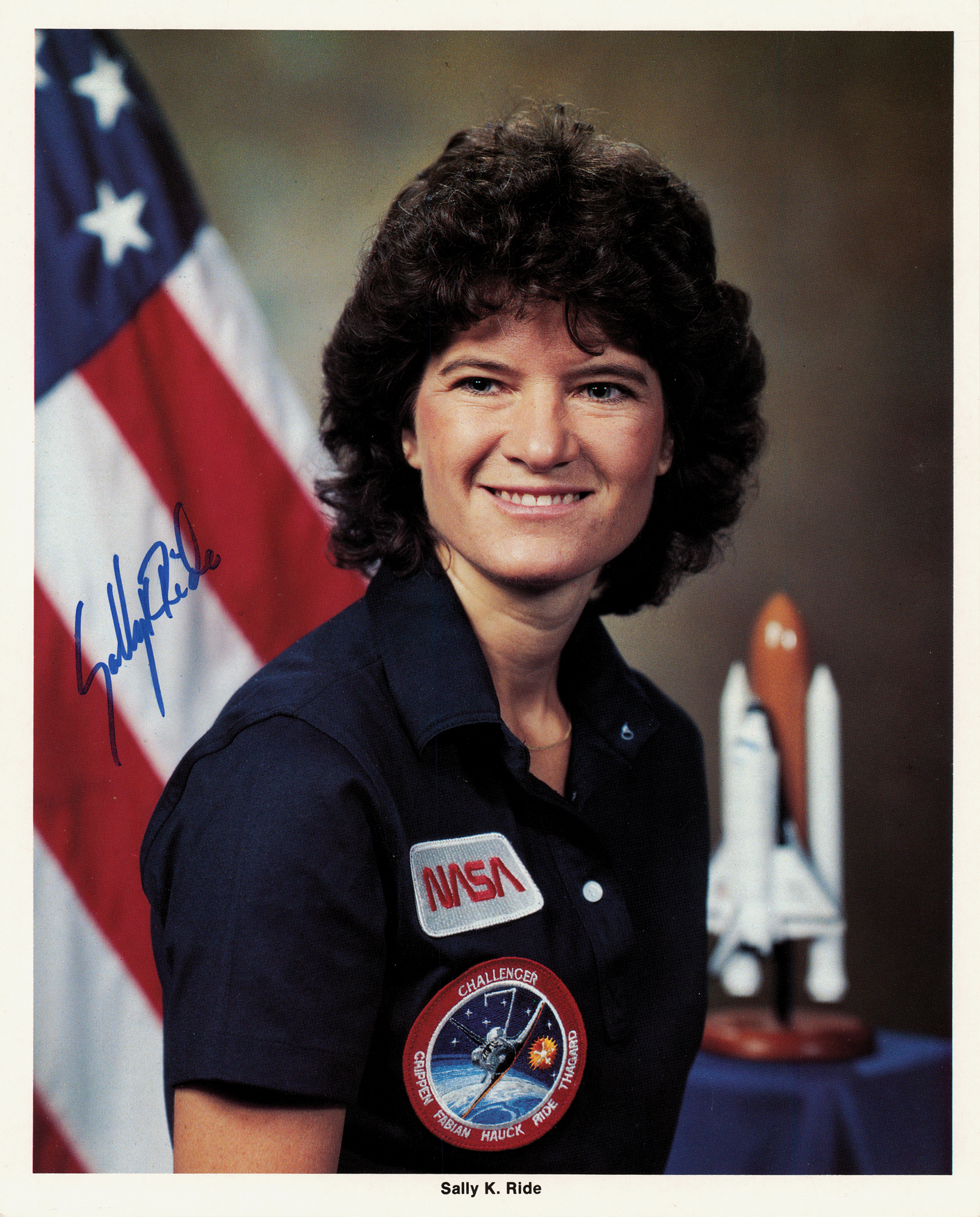 Official color 8 x 10 NASA lithograph of Ride wearing an STS-7 patch on her shirt, signed in blue felt tip, "Sally K. Ride." In fine condition, with a JSA authentication label affixed to the lower left corner of the reverse. Accompanied a certificate of authenticity from JSA.