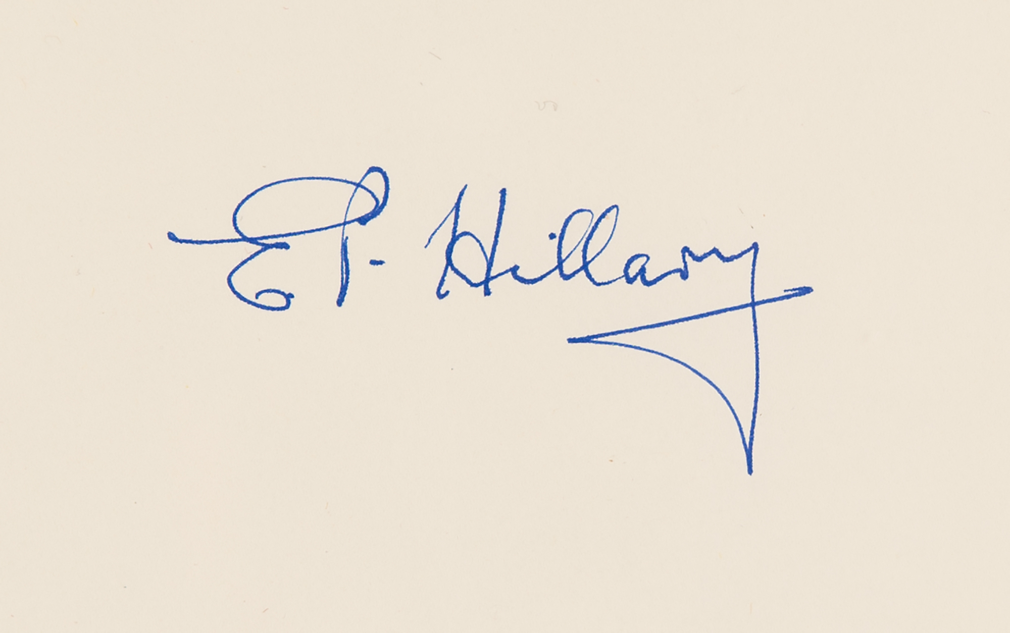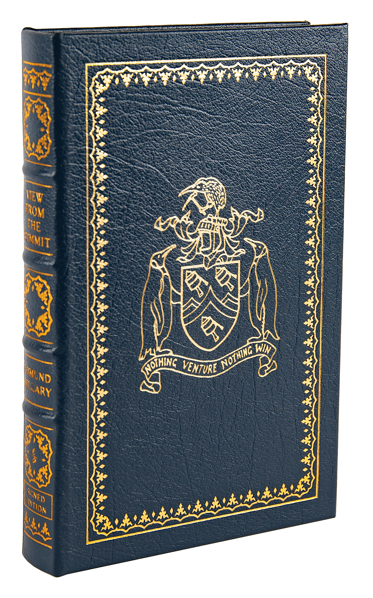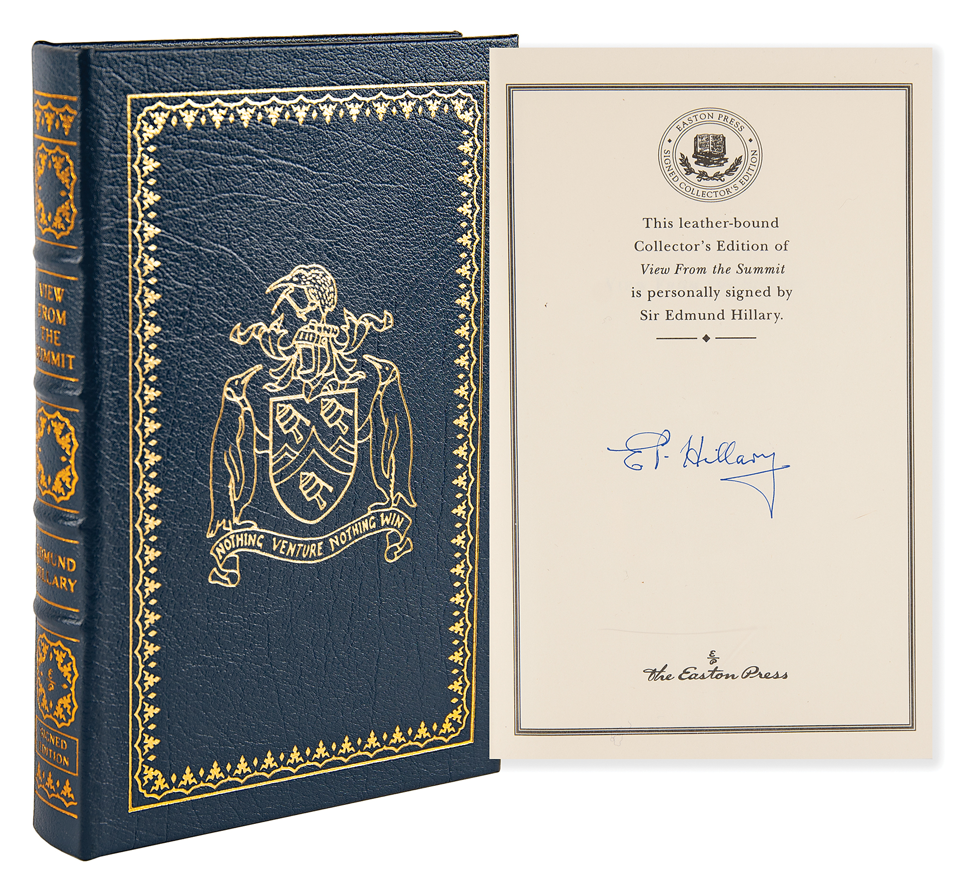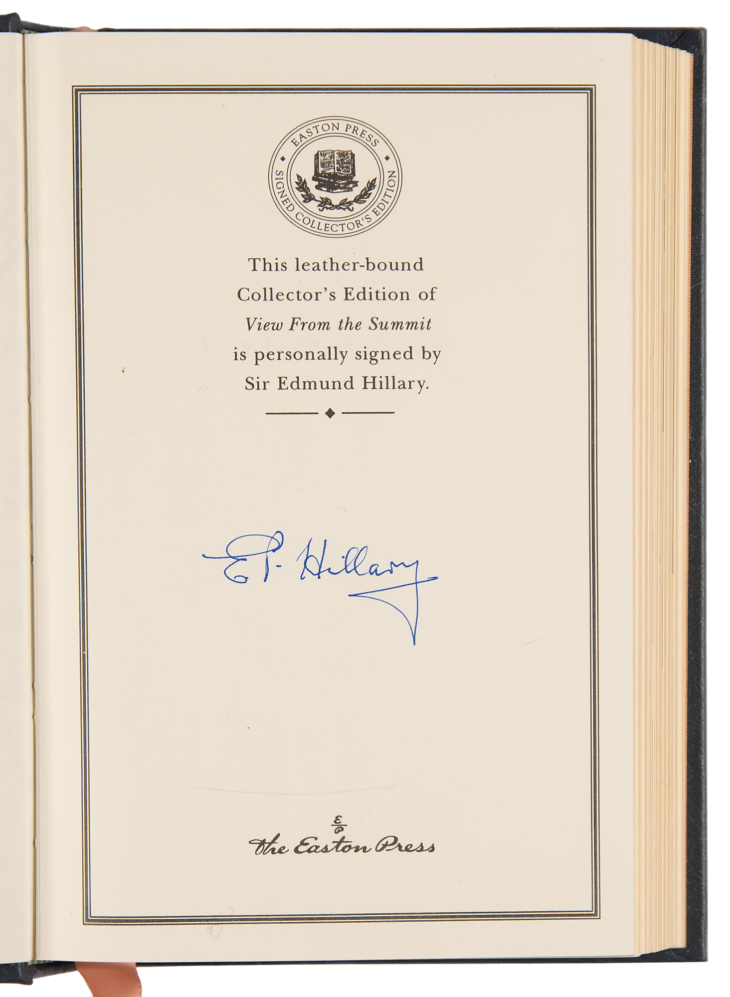 Signed book: View from the Summit. Collector's edition. Norwalk, CT: Easton Press, 1999. Leatherbound hardcover, 6.5 x 9.5, 310 pages. Signed on the colophon in blue felt tip, "E. P. Hillary." In very fine condition. Accompanied by the publisher’s certificate of authenticity.