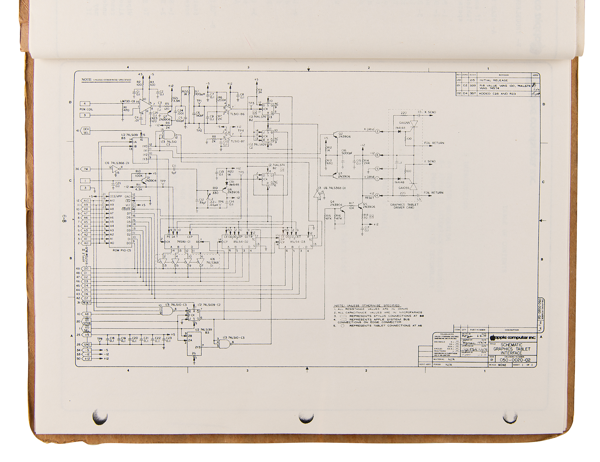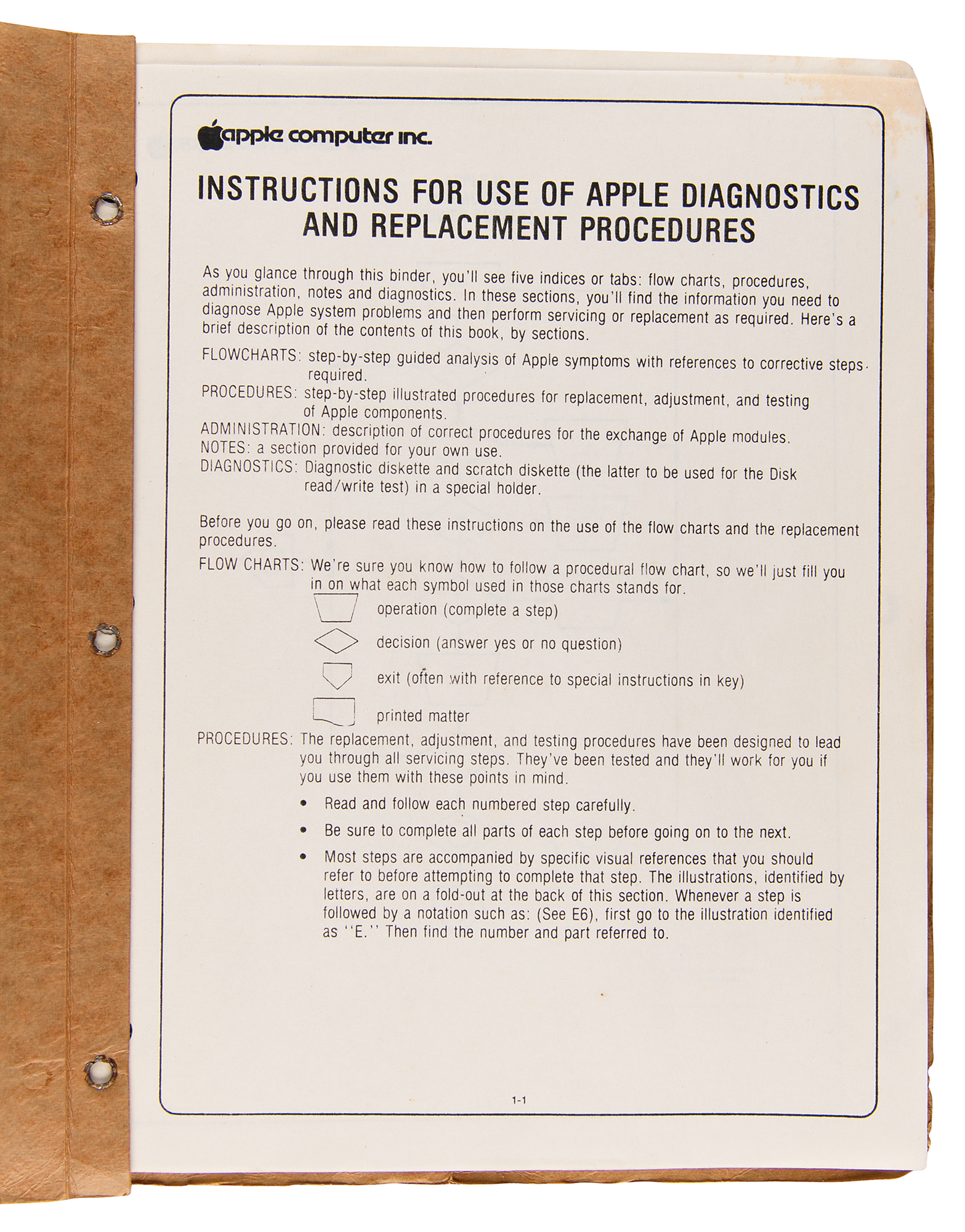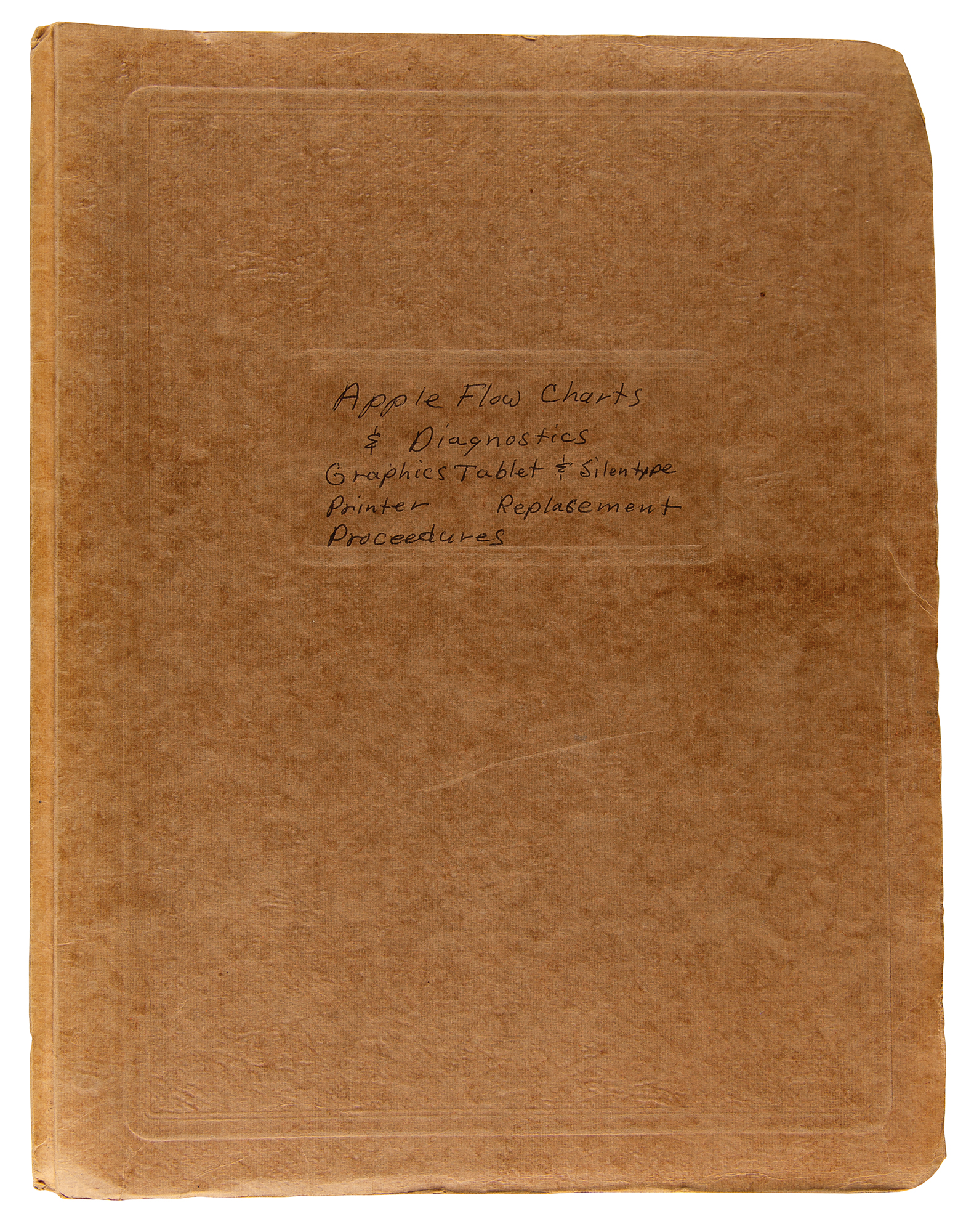 Cardstock binder containing original mimeographed copies of Apple Computer "Diagnostics and Replacement Procedures," 9 x 11.5, circa 1979–1980, containing flow charts for diagnostics of the Apple II and associated components, troubleshooting procedures for the Apple II Graphics Tablet, troubleshooting procedures for the Apple Silentype printer, and descriptive Apple II service and upgrade procedures. In very good to fine condition, with light wear and staining to one corner.