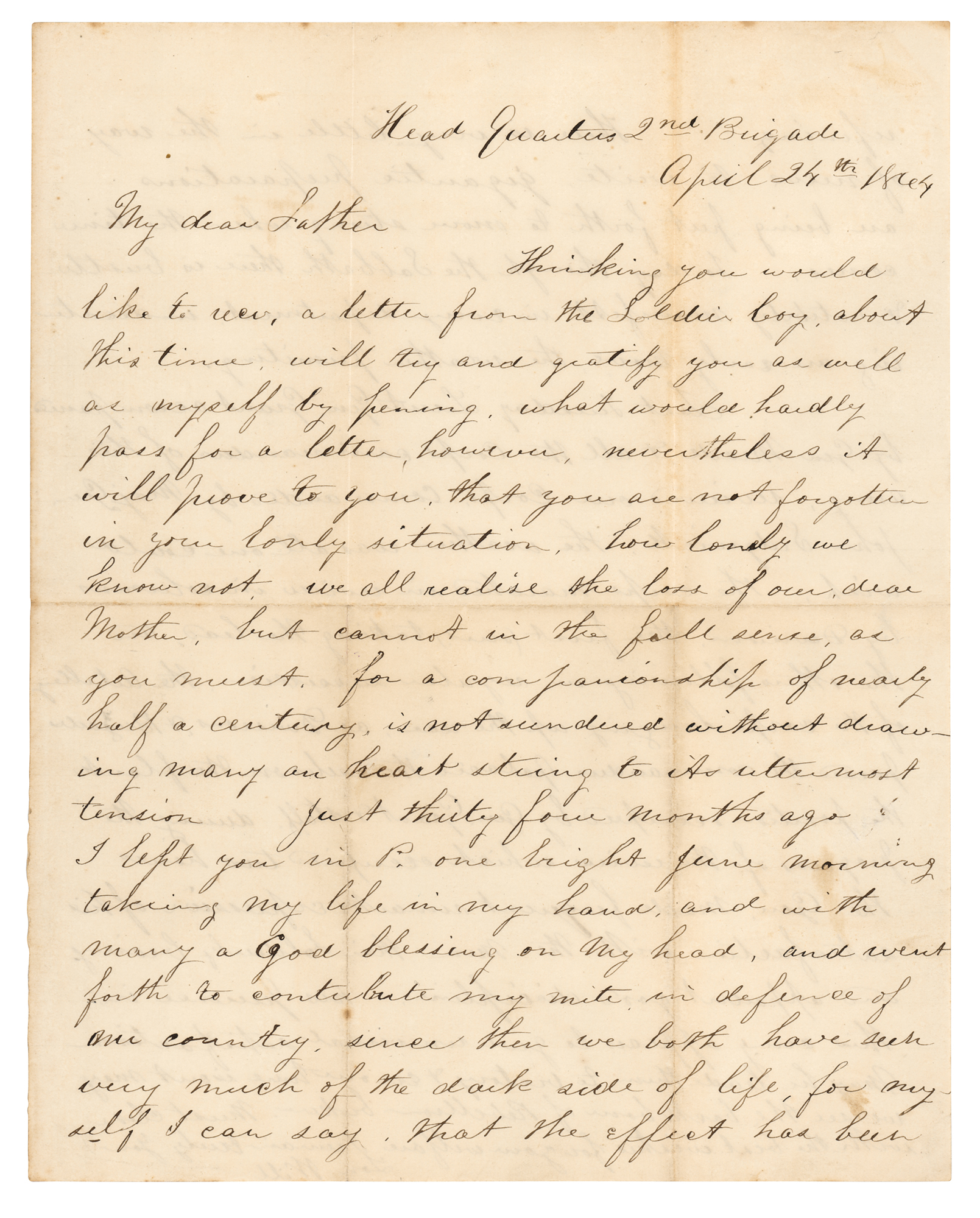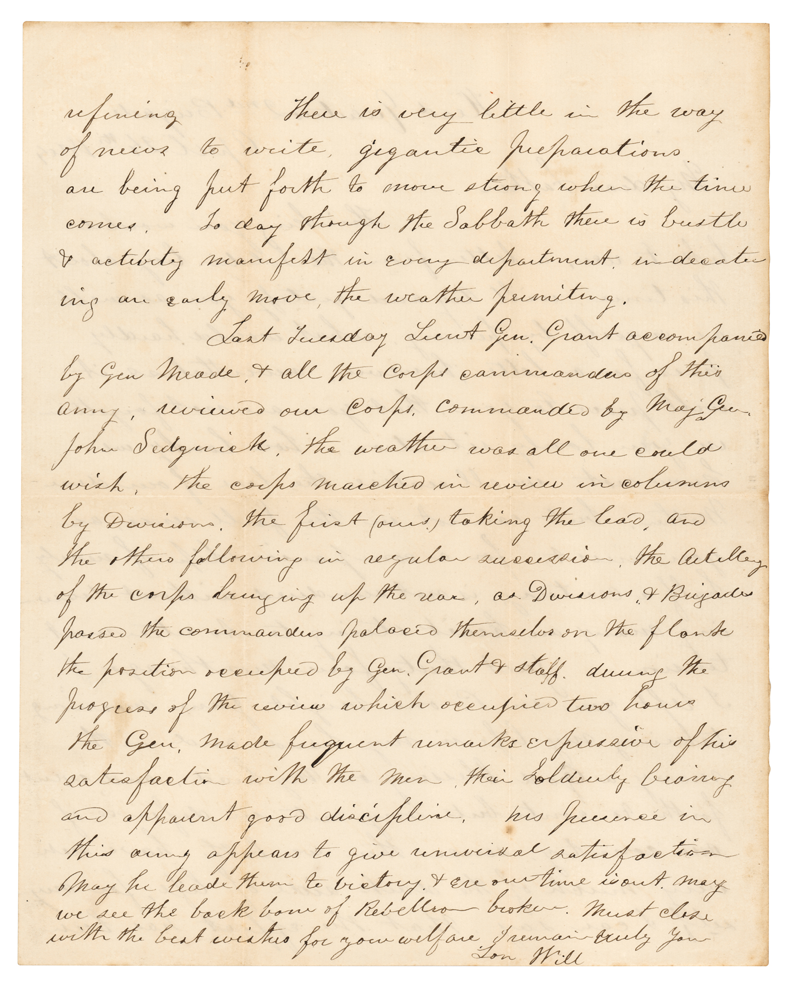 Civil War-dated ALS from a Union soldier in John Sedgwick’s VI Corps, one page, both sides, 8 x 10, April 24, 1864. Addressed from “Head Quarters, 2nd Brigade,” a handwritten letter from “Will” to his father, written mere days before the start of General Grant’s Overland Campaign, in part: “Just thirty four months ago I left you in P. one bright June Morning, taking my life in my hand and with many a God blessing On my head, went forth to contribute my mite in defense of our Country…gigantic preparations are being put forth to move strong when the time comes. Today though the Sabbath there is bustle & activity manifest in every department…Last Tuesday Lieut. Gen. Grant accompanied by Gen. Meade & all the Corps commanders of this army, reviewed our Corps commanded by Maj. Gen. John Sedgwick. The weather was all one could wish. The corps marched in review in columns by divisions, the first (ours) taking the lead, and the others following…During the progress of the review, which occupied two hours, the Gen. [Grant] made frequent remarks expressive of his satisfaction with the men, their soldierly bearing and apparent good discipline.” In fine condition, with light toning along the folds.