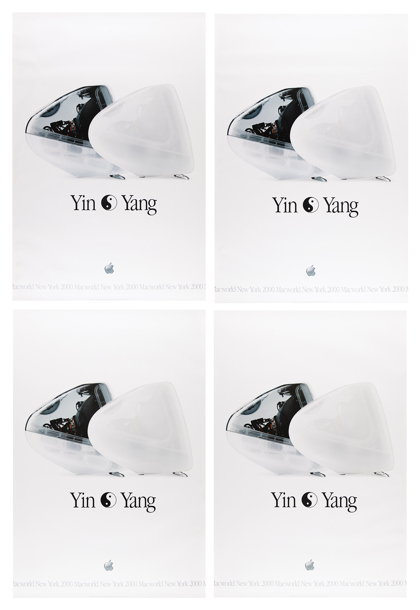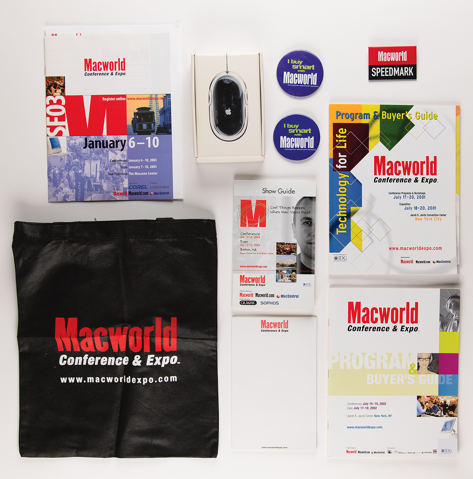 Collection of souvenirs and ephemera from various Macworld Expo events, highlighted by the Apple Pro Mouse introduced and given away at Macworld New York 2000, used but in its original box. At the end of Steve Jobs's keynote address, he informed the audience that taped under each seat was a ticket redeemable for Apple's first optical mouse—'I want all of you to be the first ones to get your hands on it,' said Jobs. Additional items include: programs from the Macworld Conference & Expo events held in 2001, 2002, 2003, and 2004; souvenirs including a tote bag, notepad, and pins; nine t-shirts; and four 24 x 36 Macworld 2000 "Yin/Yang" iMac posters. In overall very good to fine condition.