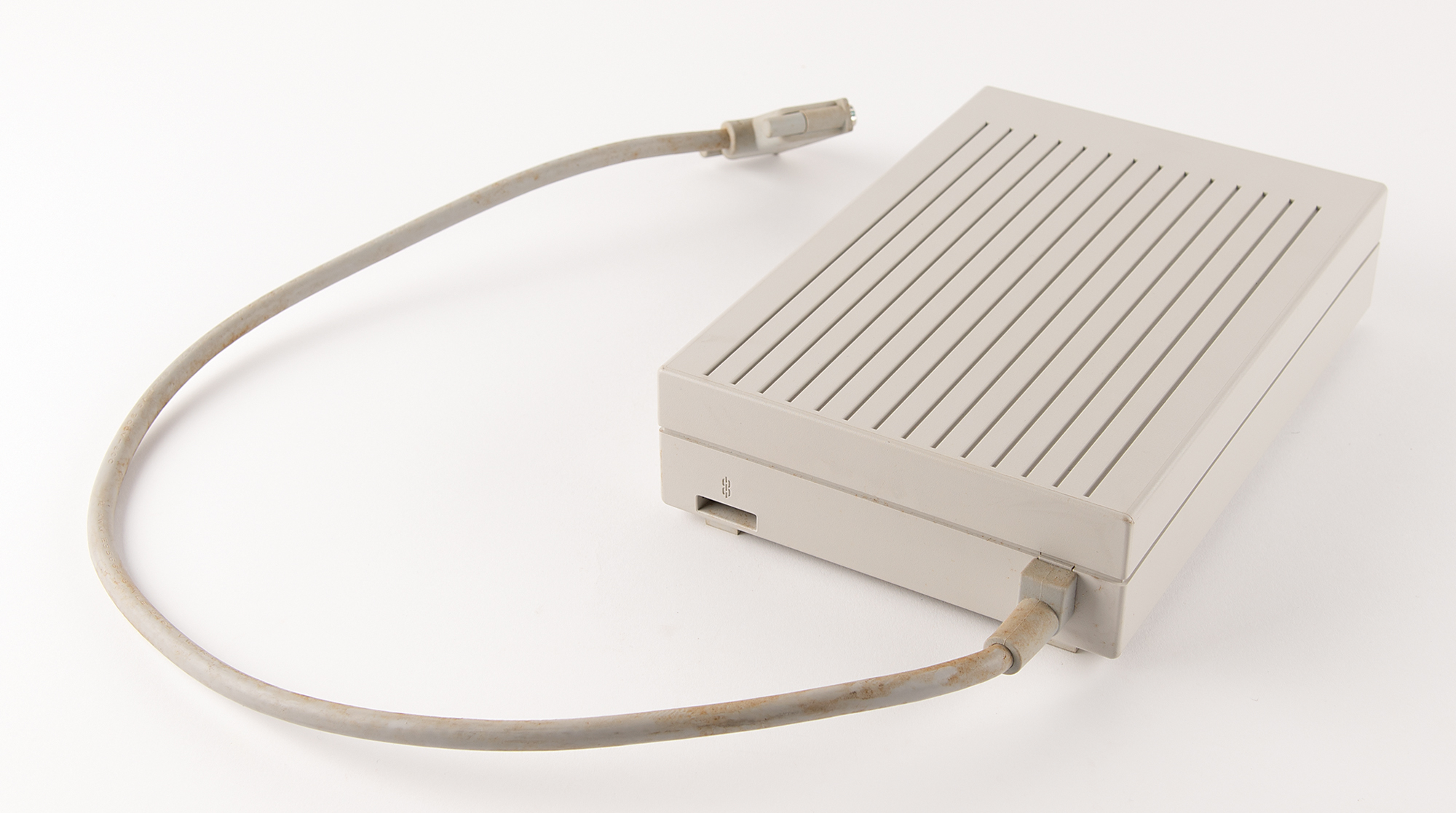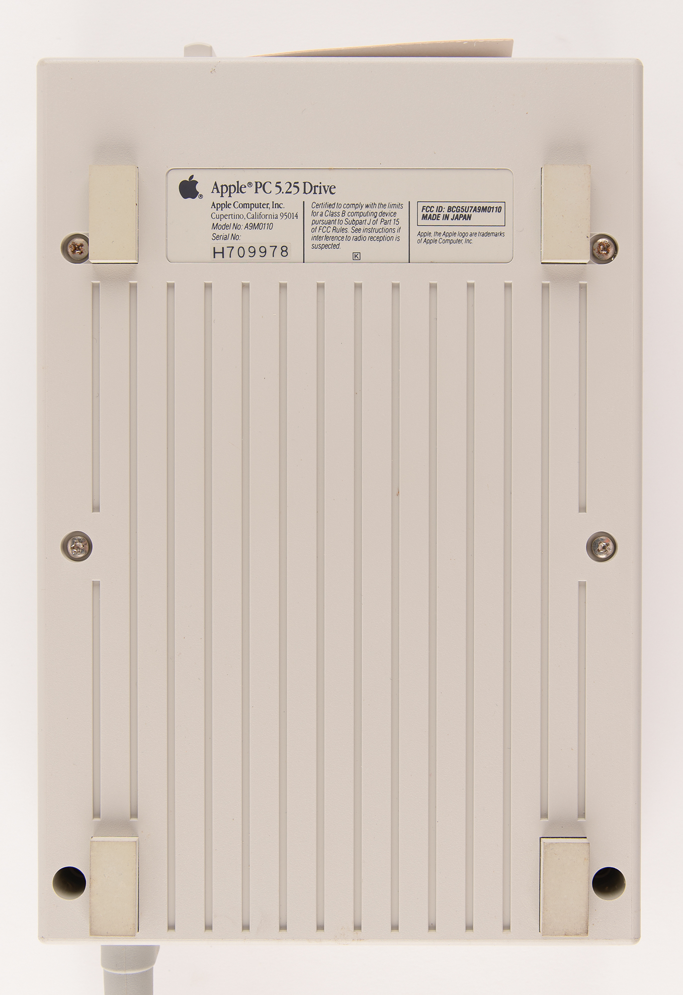 Unused Apple PC 5.25 Drive, Model No. A9M0110, Serial No. H709978, retaining its cardstock "Open" insert in the floppy disk slot. Complete with its user's manual and warranty card. In fine condition, with toning to the cord. An uncommon Macintosh peripheral, designed to transfer data between 5.25-inch MS-DOS-formatted disks and 3.5-inch Macintosh-formatted disks.