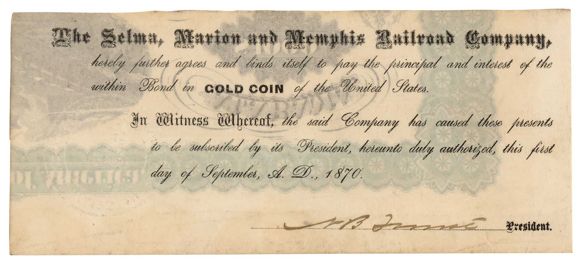 Confederate general (1821-1877) who earned a reputation as the greatest cavalry officer of the Civil War. DS, signed “N. B. Forrest,” one page, 8.25 x 3.5, September 1, 1870. Reverse of a clipped mortgage bond from the Selma, Marion and Memphis Railroad Company, which states that the company "agrees and binds itself to pay the principal and interest of the within Bond in Gold Coin of the United States." Signed at the conclusion in crisp black ink by Nathan Bedford Forrest as the company's president. In fine condition.