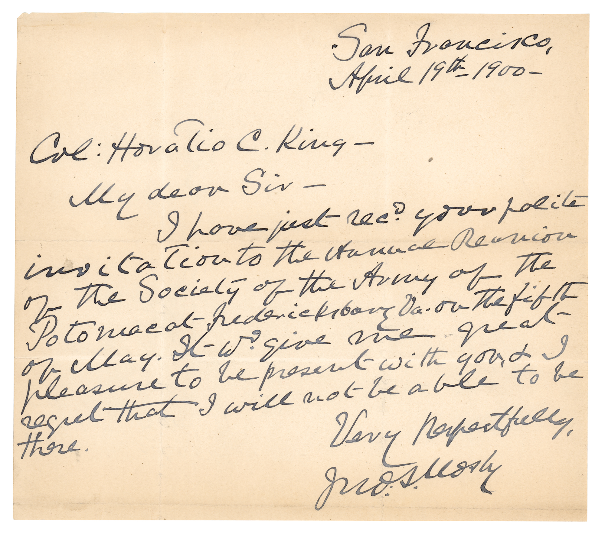 Fabled Confederate ranger (1833-1916) whose guerrilla band specialized in attacking and disrupting Union supply lines. He earned the nickname 'The Gray Ghost' for his clandestine and highly effective attack tactics. ALS signed “Jno. S. Mosby,” one page, 7.75 x 6.75, April 19, 1900. Addressed from San Francisco, a handwritten letter to Col. Horatio C. King, in full: “I have just rec’d your polite invitation to the Annual Reunion of the Society of the Army of the Potomac at Fredericksburg Va. on the fifth of May. It w’d give me great pleasure to be present with you, & I regret that I will not be able to be there.” In fine condition.