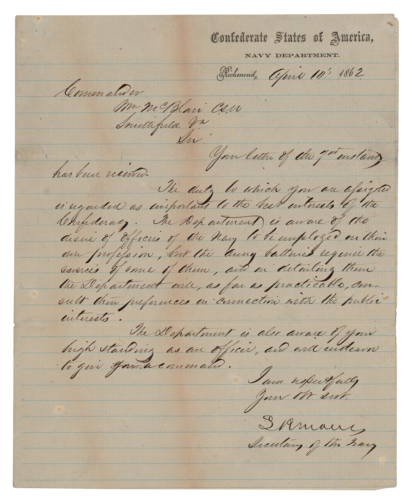 Democratic senator from Florida (1812-1873) who served as the Confederate States Secretary of the Navy. Civil War-dated LS, one page, 8 x 9.75, Confederate States of America (Navy Department) letterhead, April 10, 1862. Letter to Commander William McBlair, in full: “Your letter of the 7th instant has been received. The duty to which you are assigned is regarded as important to the best interest of the Confederacy. The Department is aware of the desire of officers of the Navy to be employed in their own profession, but the army batteries require the services of some of them, and in detailing them the Department will, as far as practicable, consult their preferences in connection with the public interests. The Department is also aware of your high standing as an officer, and will endeavor to give you a command.” In fine condition, with two faint vertical lines of toning.