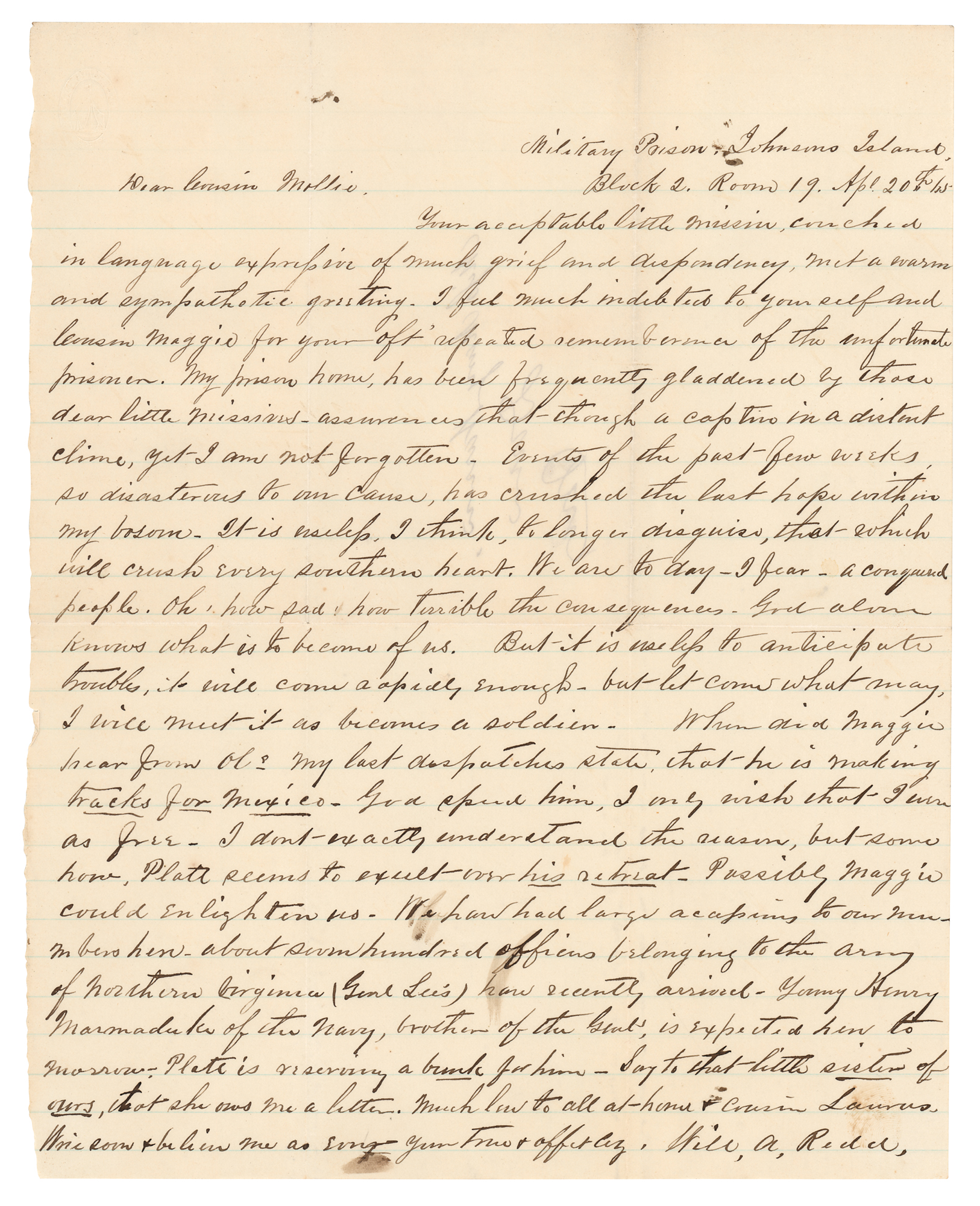 Civil War-dated ALS from a Confederate prisoner, signed “Will. A. Red,” one page, 7.75 x 9.75, April 20, 1865. Addressed from “Military Prison, Johnson's Island,” a handwritten letter to his cousin Mollie, in part: “Your acceptable little missive, couched in language expression of much grief and despondency, met a warm and sympathetic greeting…My prison home has been frequently gladdened by those dear little missives—assurances that, though a captive in a distant clime, yet I am not forgotten. Events of the past few weeks, so disastrous to our cause, have crushed the last hope within my bosom. It is useless, I think, to longer disguise that which will crush every southern heart. We are today, I fear, a conquered people…God alone knows what is to become of us…We have had large accessions to our numbers here about seven hundred officers belonging to the Army of Northern Virginia (Genl Lee's) have recently arrived.” In fine condition.