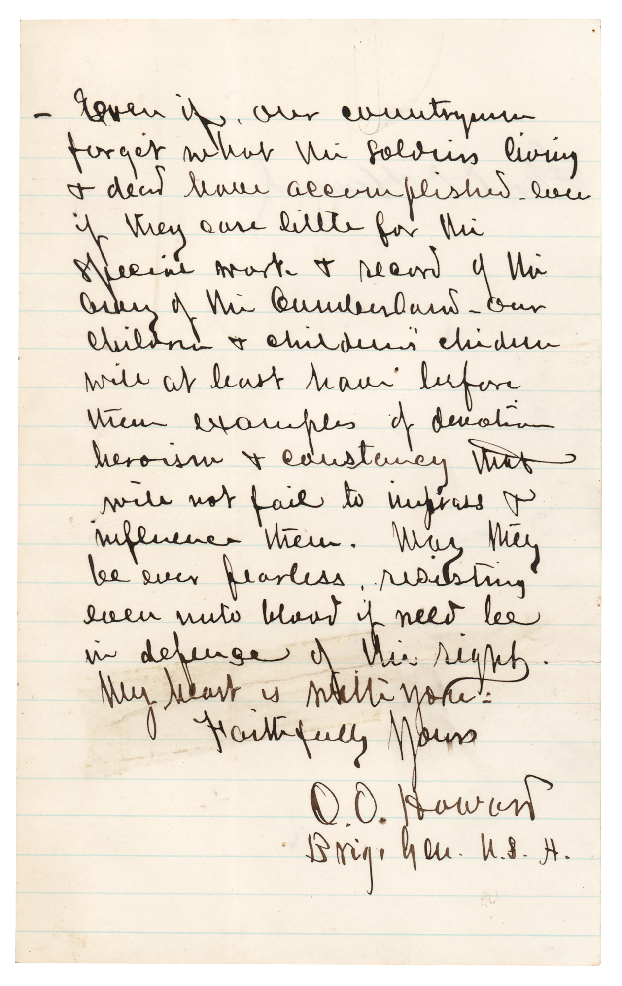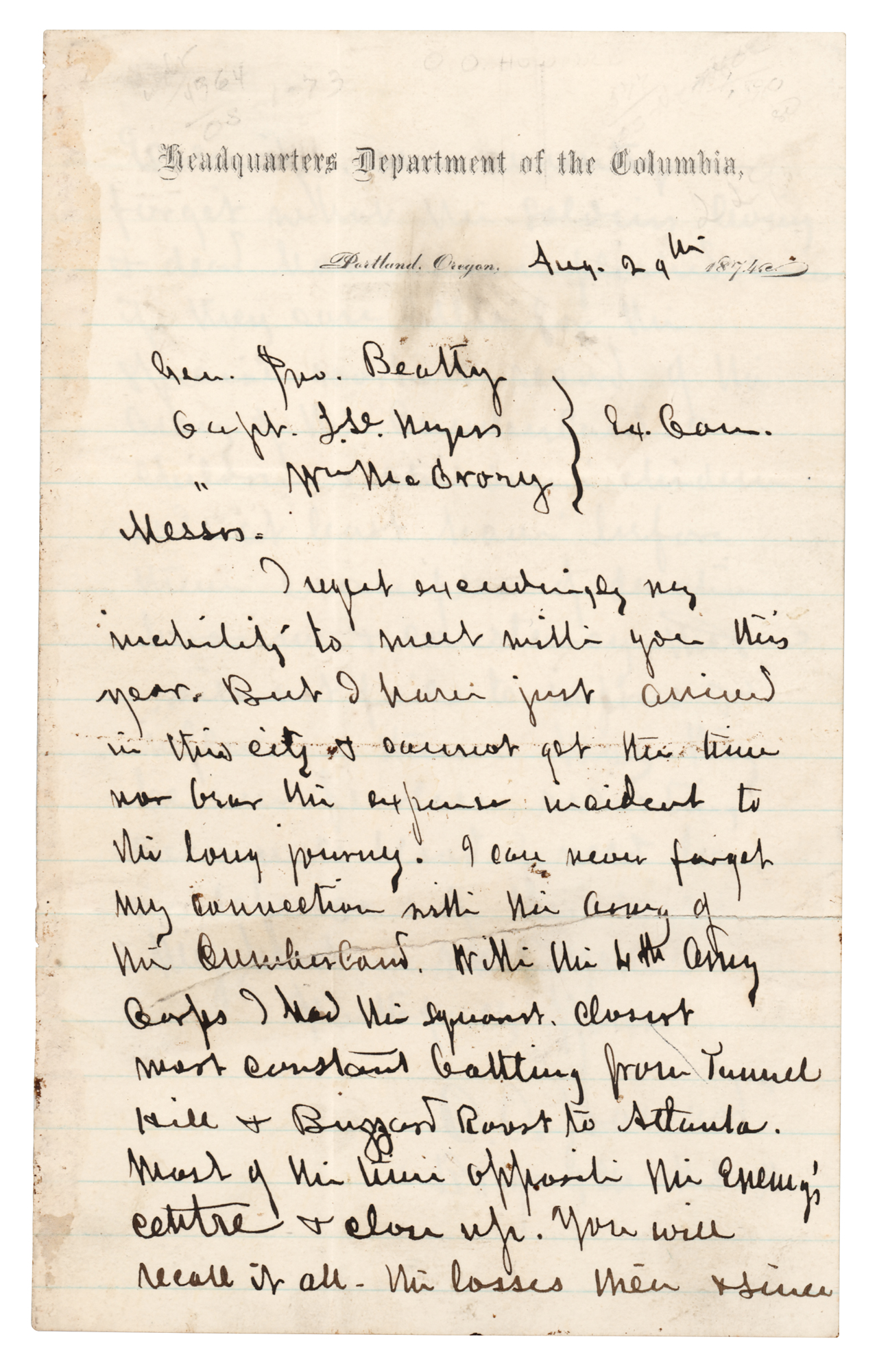One-armed Union general (1830–1909) who participated at Gettysburg and commanded the Army of Tennessee during Sherman's March to the Sea. ALS signed “O. O. Howard, Brig. Gen. U.S.A.,” two pages on two adjoining sheets, 5 x 8, Headquarters Department of the Columbia letterhead, August 29, 1874. Handwritten letter to a trio of senior officers, in part: “I can never forget my connection with the Army of the Cumberland. With the 4th Army Corps I had the squarest, closest, most constant battling from Tunnel Hill & Buzzard Roost to Atlanta, most of the time opposite the enemy's centre & close up. You will recall it all — the losses then & since even if, our countrymen forget what the soldiers living & dead have accomplished…our children & children's children will at least have before them examples of devotion, heroism & constancy that will not fail to impress & influence them. May they be ever fearless, resisting even unto blood if need be in defense of the right. My heart is with you.” In very good to fine condition, with some light soiling, and a repaired tear to each page.
