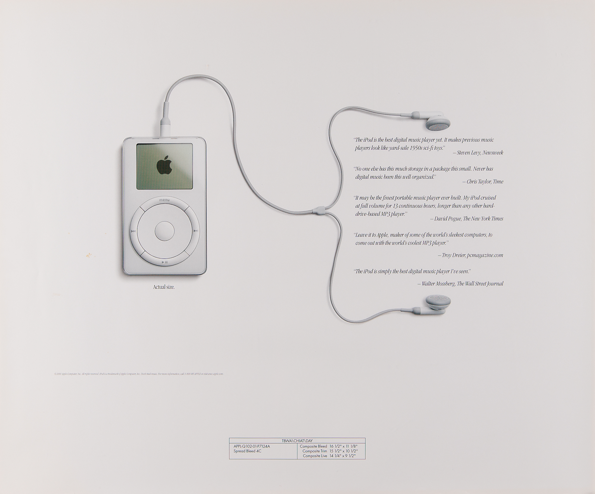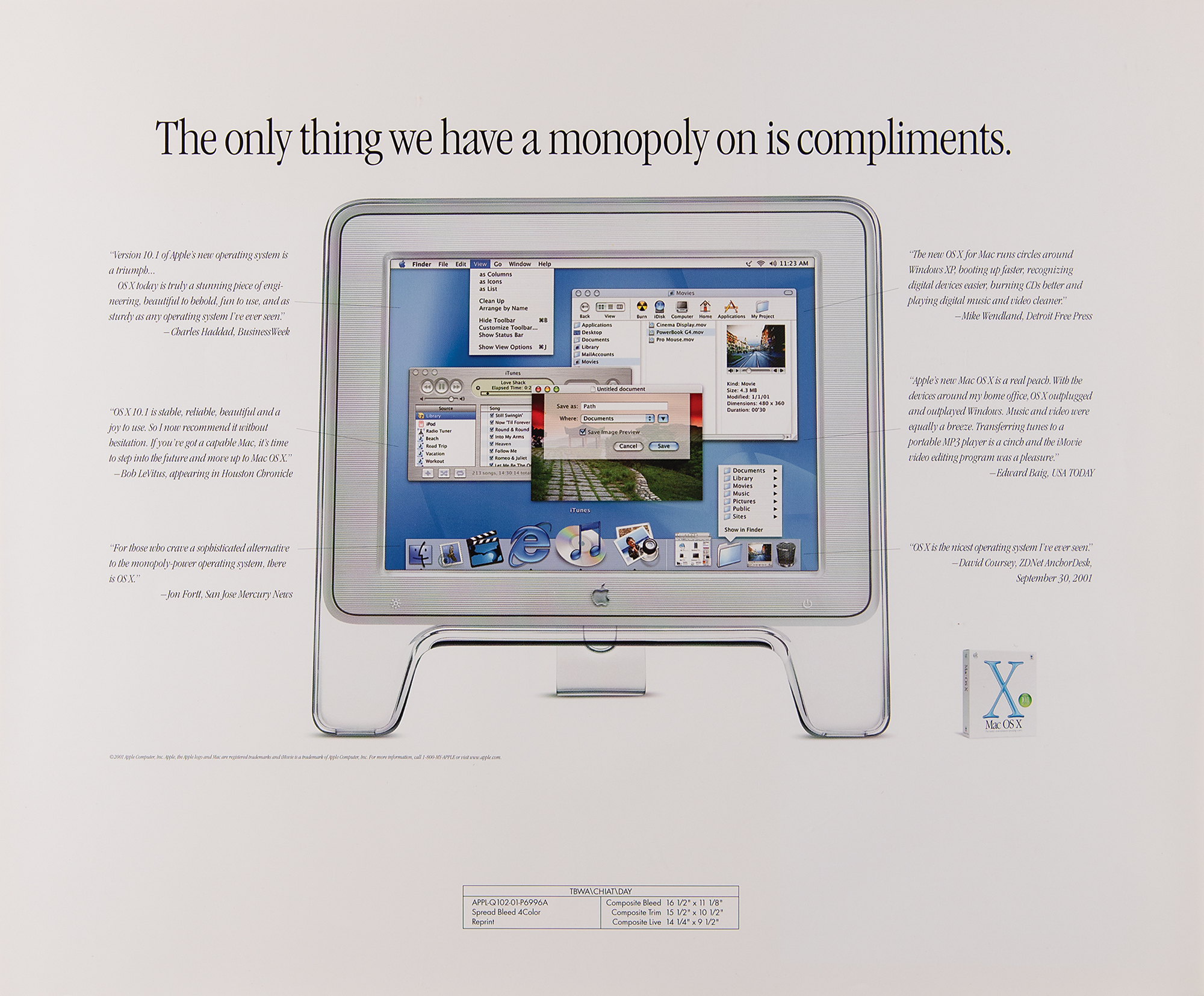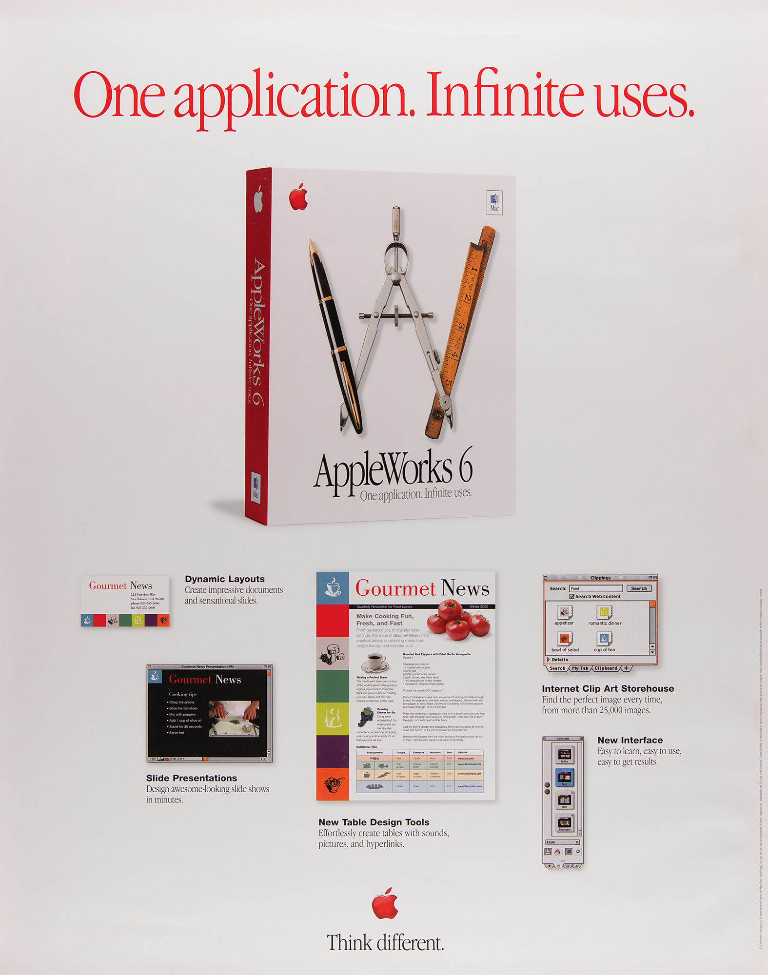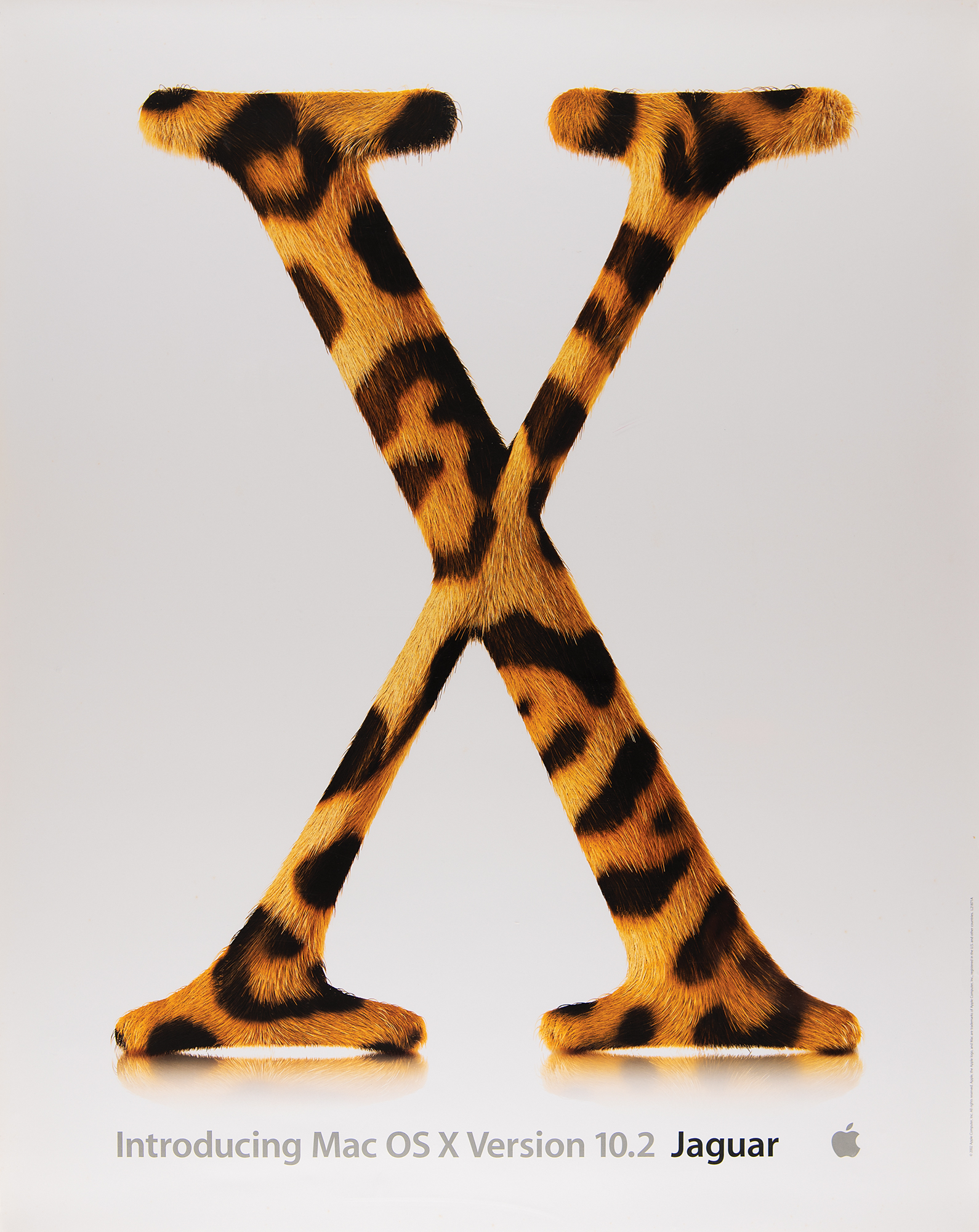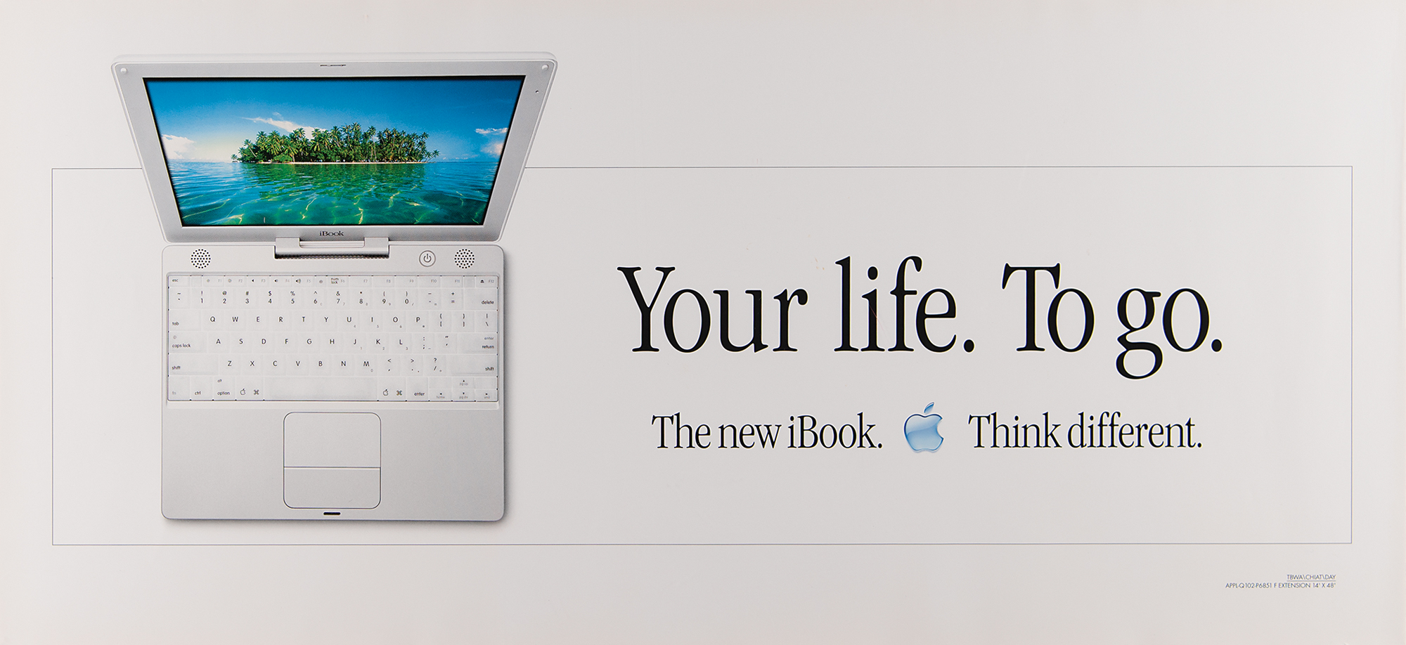 Group of seven Apple Computer promotional posters, ranging in size from 17.5 x 14.5 to 22 x 28, for products including: iBook G3 'Clamshell,' iBook, iPod, Mac OS X, Mac OS X Jaguar, Microsoft Office for Mac, and AppleWorks 6. Rolled and in overall fine condition, with some minor scattered creases.
