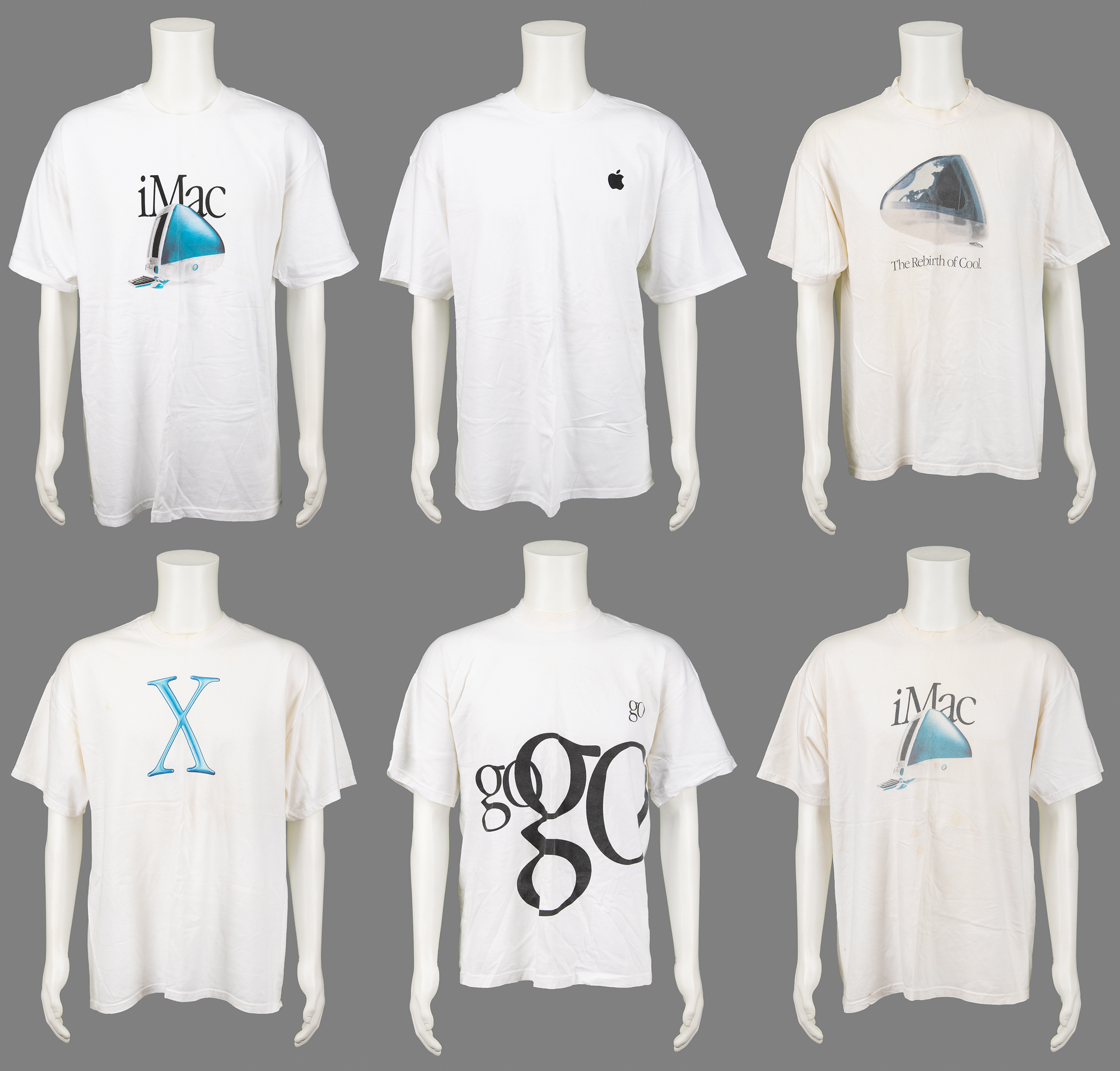 Group of eight Apple Computer promotional t-shirts, all size XL, including shirts for: iMac (4), Mac OS X, Mac OS X Jaguar, iBook Clamshell, and Power Mac G4 Cube. In very good to fine condition, with some scattered staining; two are still sealed in their original plastic (iMac and G4 Cube).