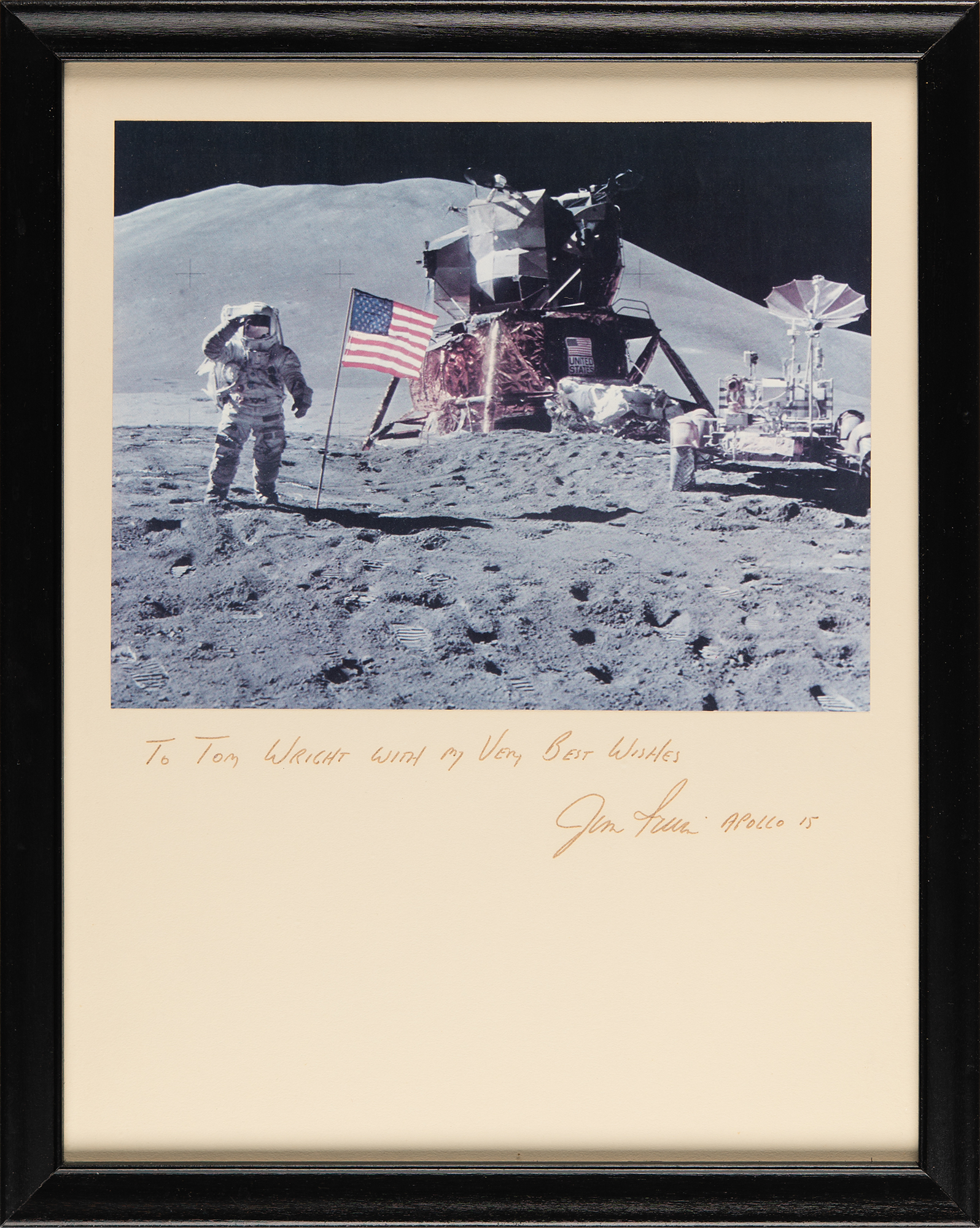 Color matte-finish 9.5 x 7.25 photo of Apollo 15 LMP Jim Irwin saluting the American flag on the lunar surface, affixed to a 10.5 x 13.5 mount, signed and inscribed on the mount in brown felt tip, "To Tom Wright with my very best wishes, Jim Irwin, Apollo 15.” Framed to an overall size of 12 x 15.25. In fine condition.