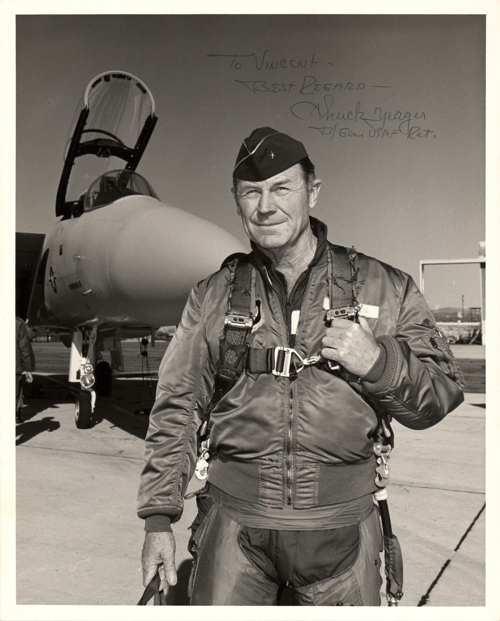 Matte-finish 8 x 10 photo of Yeager posing in front of a McDonnell Douglas F-15 Eagle, signed and inscribed in pencil, "To Vincent, Best Regard—Chuck Yeager, B. Gen. USAF Ret.” In fine condition, with a bit of rippling along the top edge.