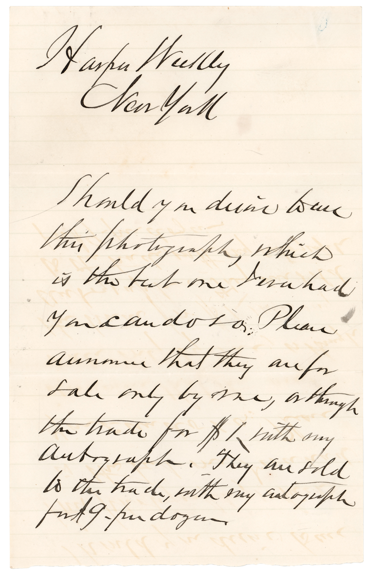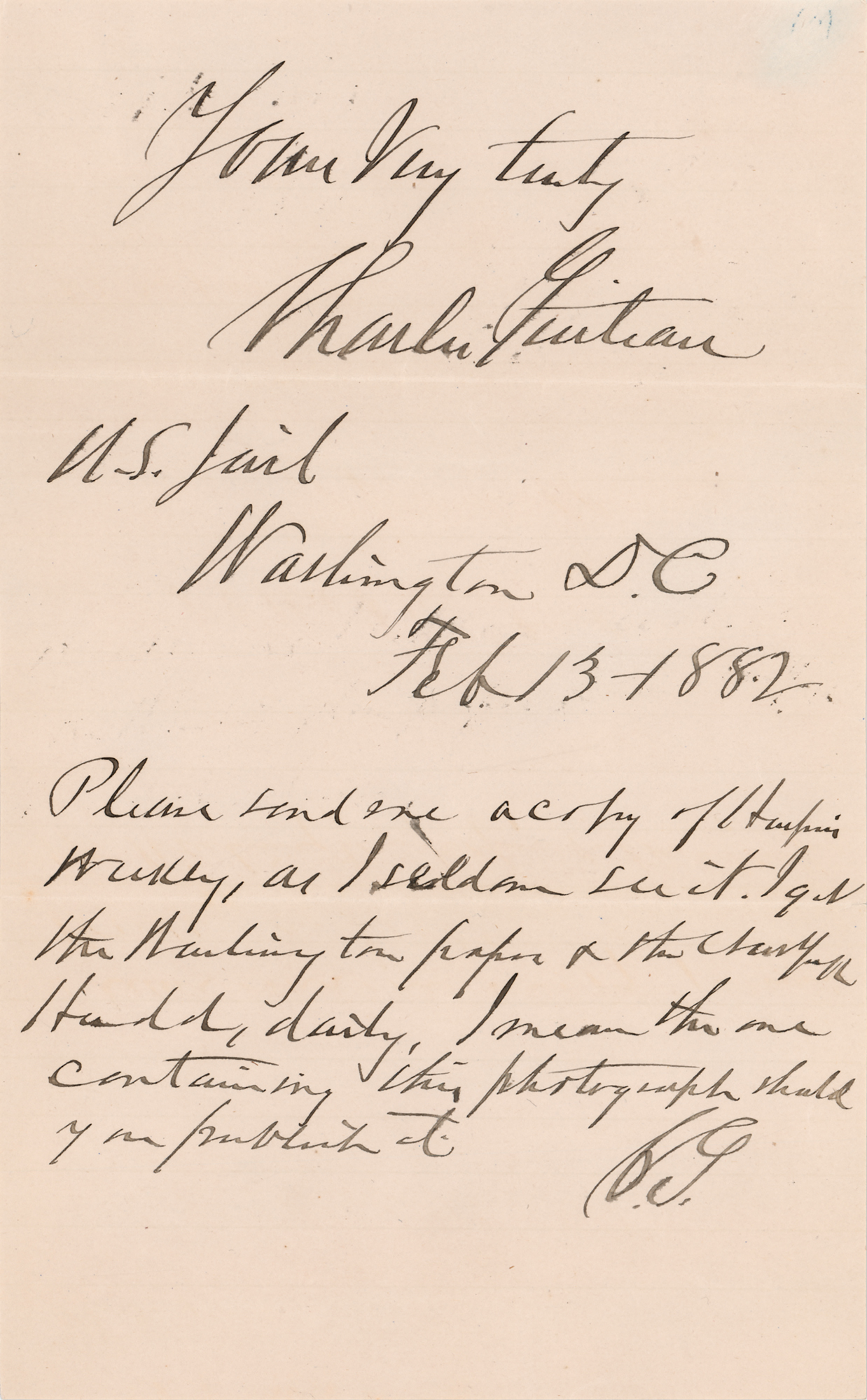 ALS, two pages, 5 x 8, February 13, 1882. Addressed from “U.S. Jail, Washington, D.C.,” a handwritten letter to Harper's Weekly in New York, in full: “Should you desire to use this photograph, which is the best one I ever had you can do so. Please announce that they are for sale only by me, or through the trade for $1 with my autograph. They are sold to the trade, with my autograph for $9 per dozen.” Guiteau signs with his initials, “C.G.,” at the close of a postscript: “Please send a copy of Harper's Weekly, as I seldom see it. I get the Washington paper & the New York Herald daily. I mean the one containing this photograph should you publish it.” In fine condition.