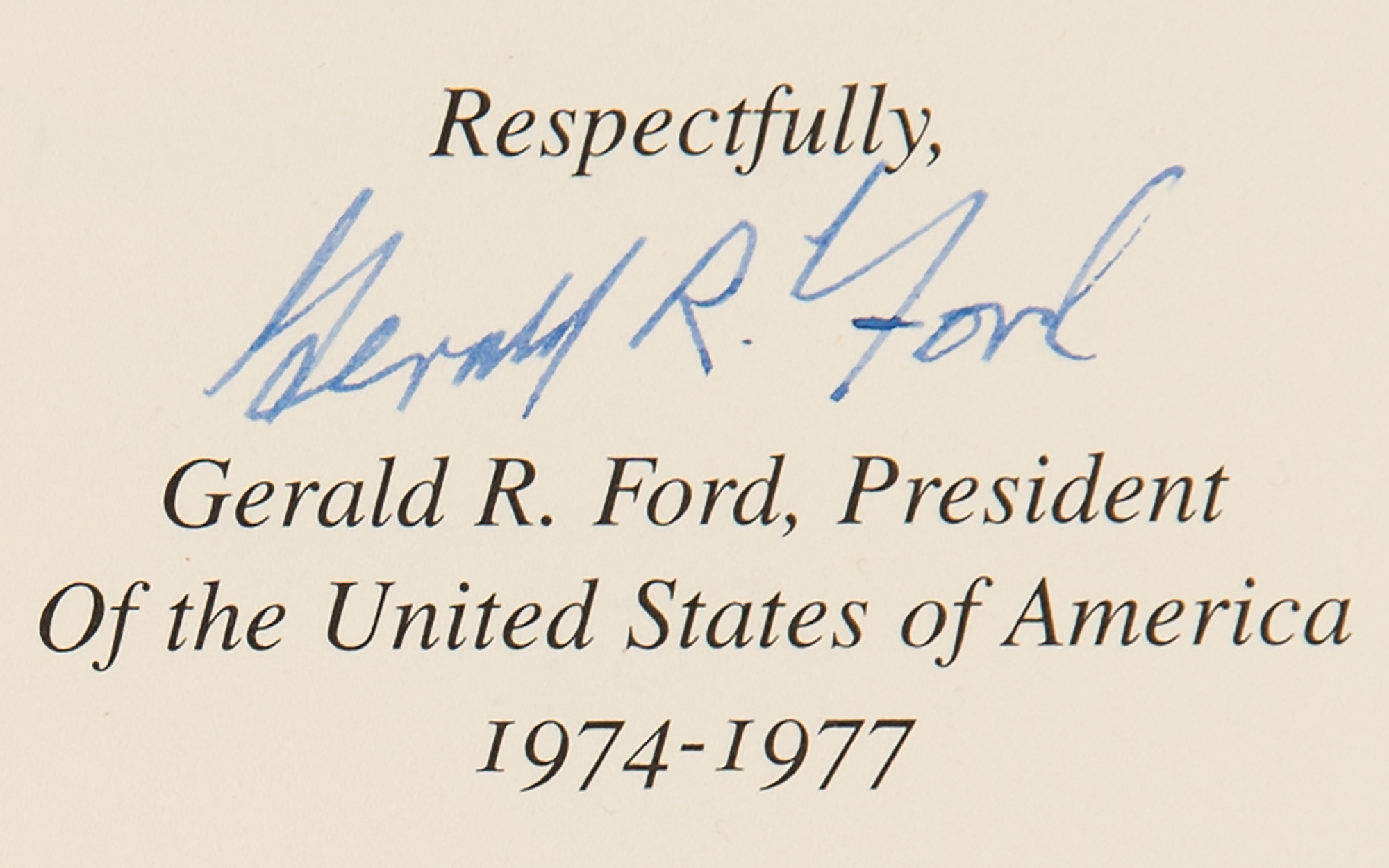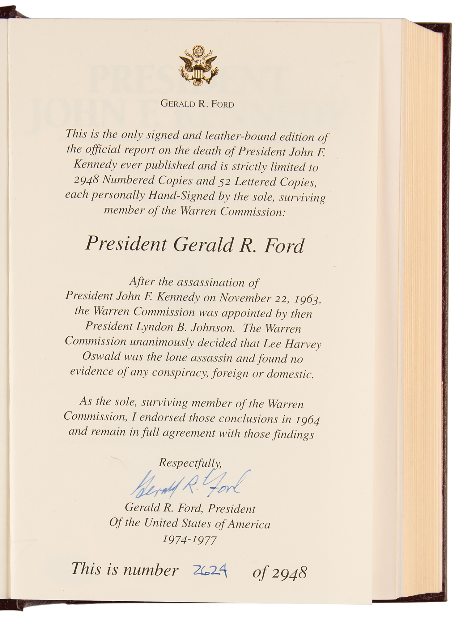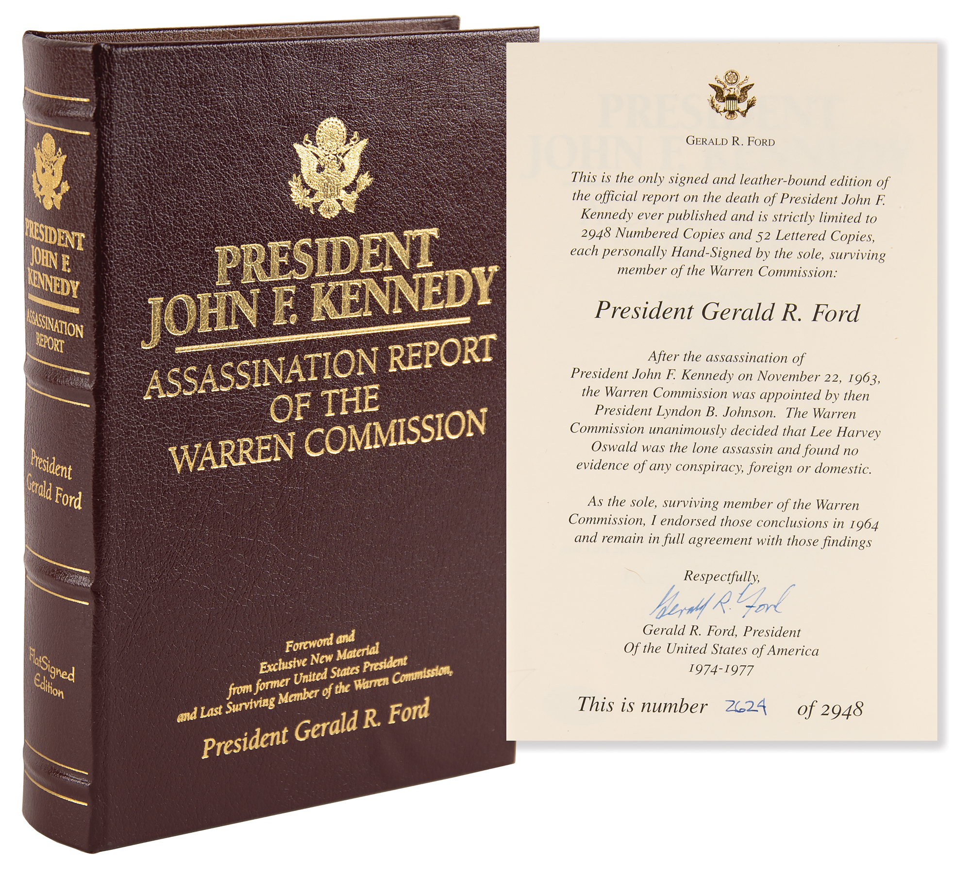 Signed book: President John F. Kennedy: Assassination Report of the Warren Commission. Limited edition, numbered 2624/2948. Nashville: FlatSigned Press, 2004. Leather-bound hardcover, 6.5 x 9.5, 608 pages. Signed on the colophon in blue ink, "Gerald R. Ford." In very fine condition. Accompanied by a certificate of authenticity from the publisher and a photo of Ford taken at a signing event.