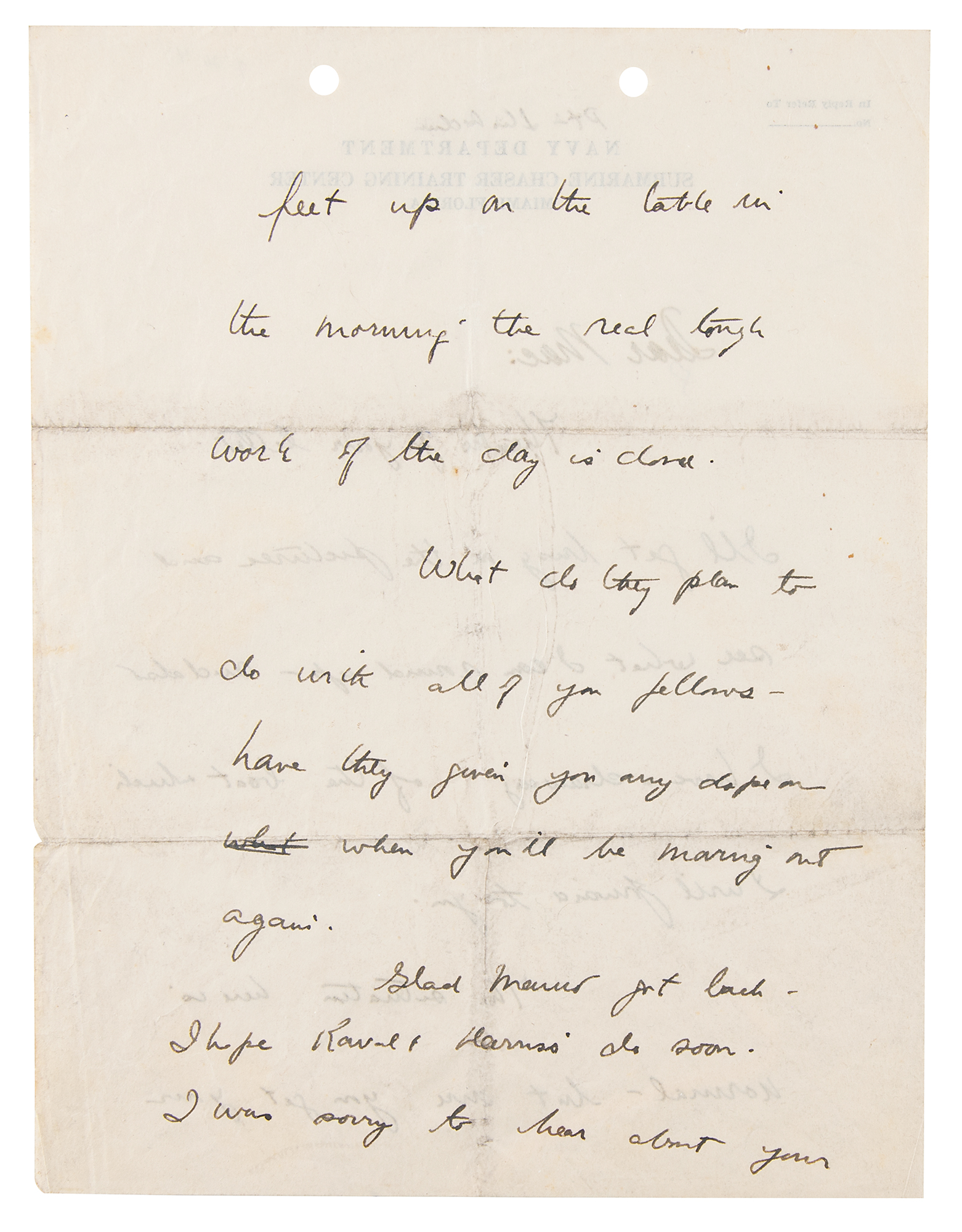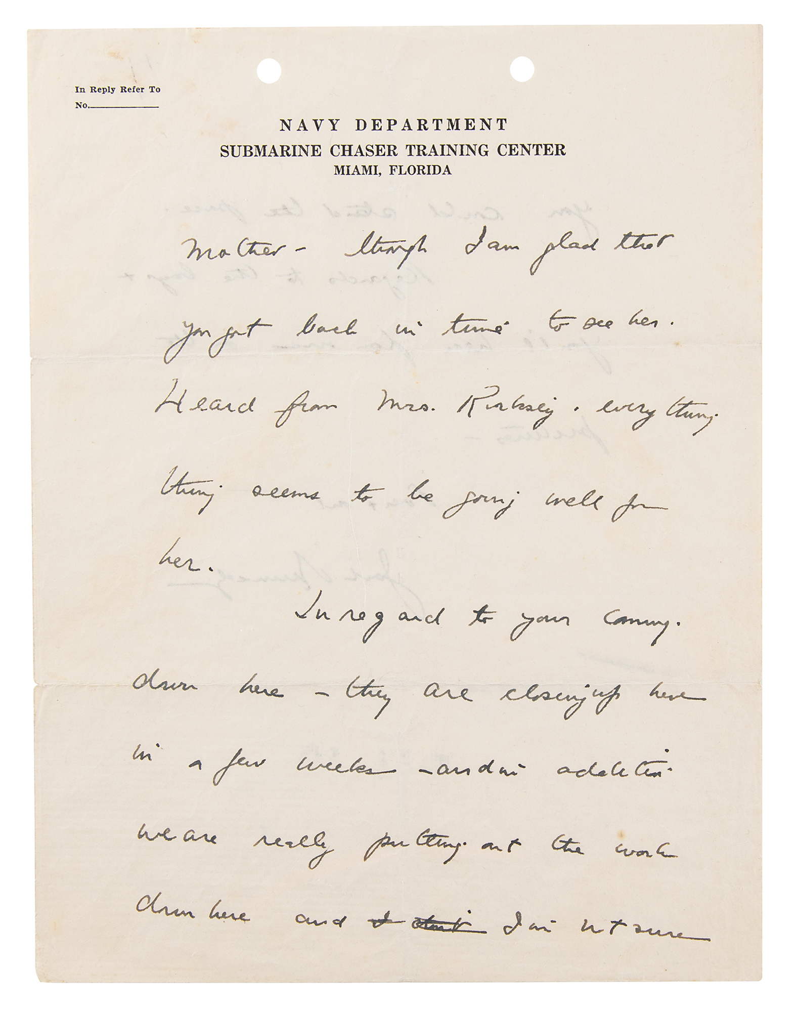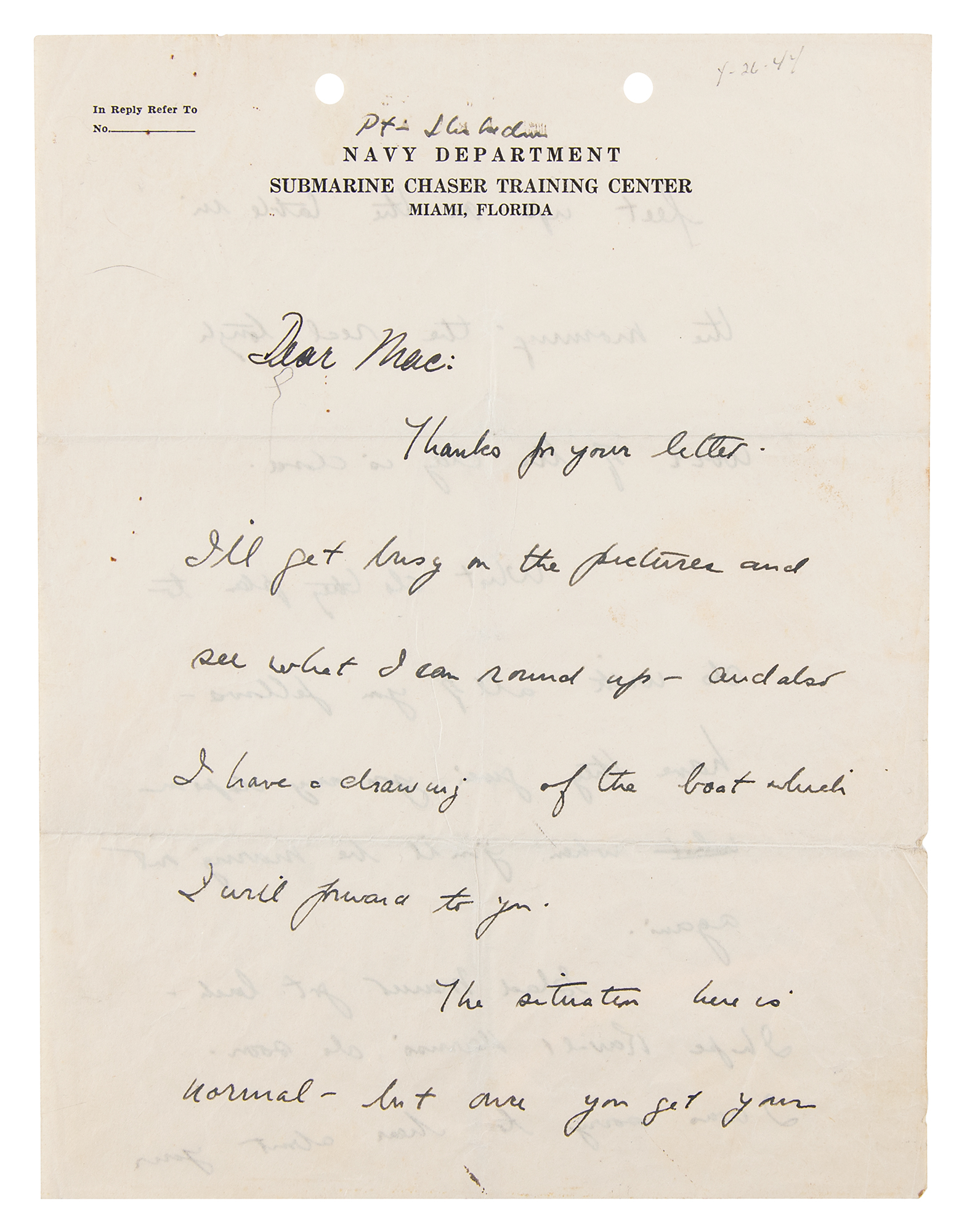 World War II-dated ALS signed “Jack Kennedy,” four pages, 8 x 10.5, Navy Department, Submarine Chaser Training Center (Miami, Florida) letterhead, April 26, 1944. Handwritten letter to “Mac,” fellow PT-109 survivor John E. Maguire, in full: “Thanks for your letter. I’ll get busy on the pictures and see what I can round up—and also I have a drawing of the boat which I will forward to you. The situation here is normal—but once you get your feet up on the table in the morning the real tough work of the day is done. What do they plan to do with all of you fellows—have they given you any date or when you’ll be moving out again. Glad [Edgar] Mauer got back—I hope [Maurice] Kawal & [Charles] Harris do soon. I was sorry to hear about your mother—though I am glad that you got back in time to see her. Heard from Mrs. [Andrew] Kirksey, everything seems to be going well for her. In regard to your coming down here—they are closing up here in a few weeks—and in addition are really putting out the work down here and I am not sure you could stand the pace. Regards to the boys & you’ll hear from me on the pictures.” In very good to fine condition, with light soiling and handling wear.