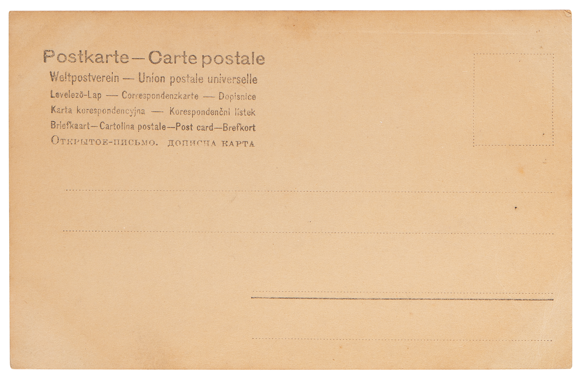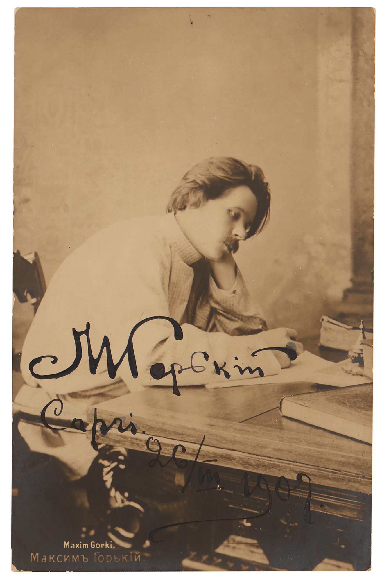 Important Russian writer (1868–1936) who was a founder of the socialist realism literary method. Vintage matte-finish 3.5 x 5.25 postcard photo of the celebrated writer hard at work, boldly signed in ink in Cyrillic, "M. Gorki, Capri, 26/m 1907.” In fine condition. Gorky moved to Capri in November 1906. He initially planned to stay for a few months but ended up living there for more than seven years, until December 1913. During this Italian period, works written by Gorky include A Confession, The Life of a Useless Man, The Life of Matvei Kozhemyakin, and many more.