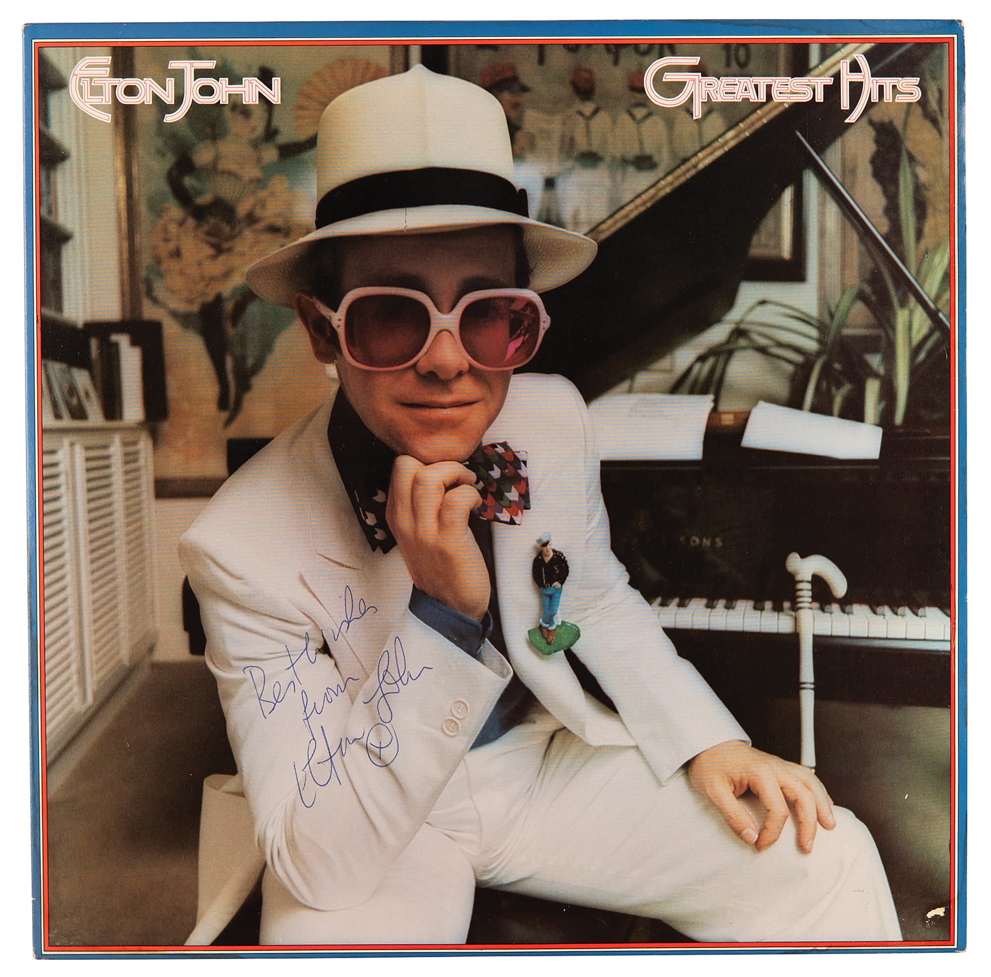 Greatest Hits compilation album by Elton John, who has signed the front cover in blue ballpoint, "Best wishes from Elton John, x." In fine condition, with a small area of surface loss to the lower right corner. The record is included. The consignor notes that this album was signed at MCA Records in 1974.