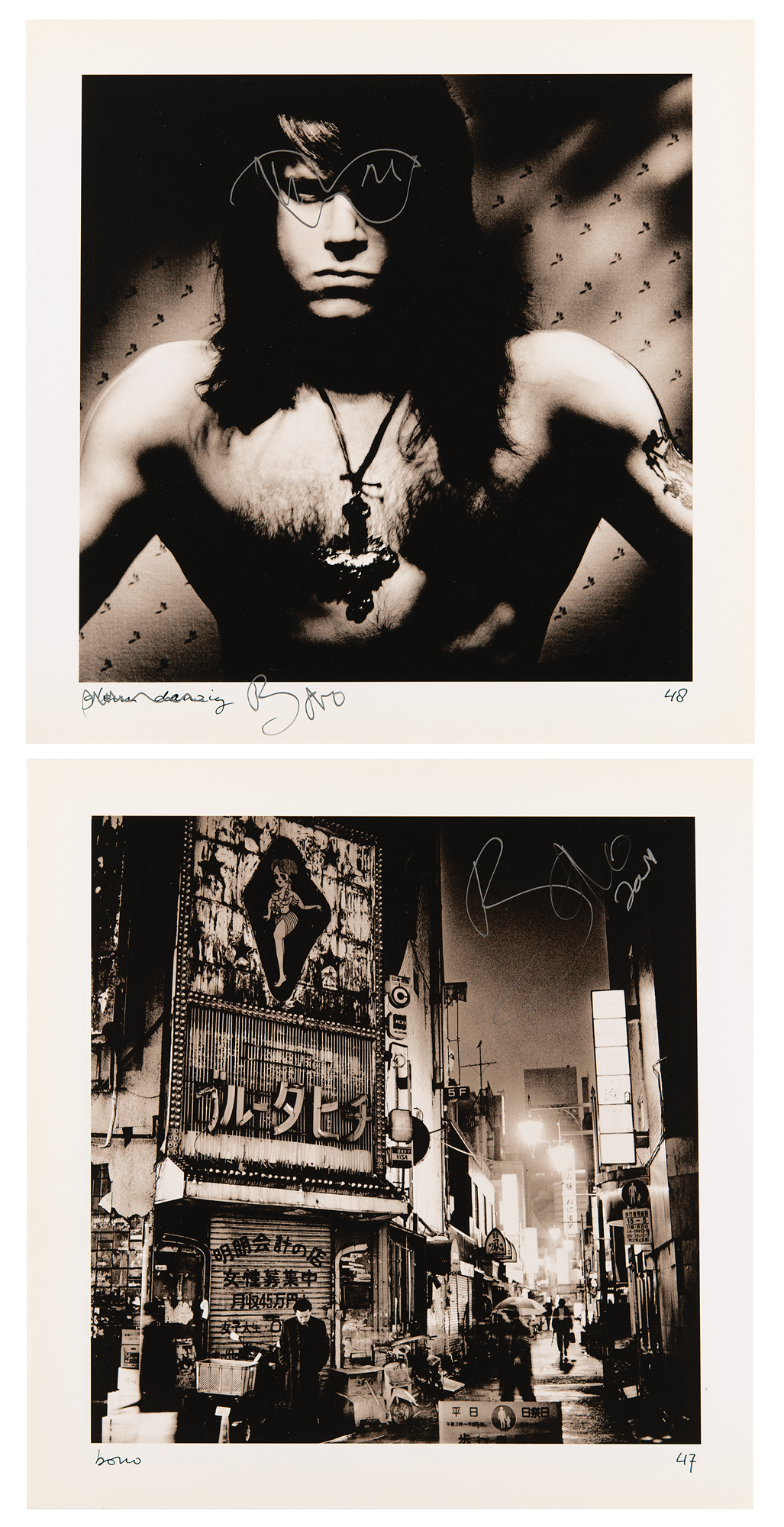 Two glossy 11.5 x 11.5 pages from a photography book by Dutch photographer Anton Corbijn, with one page depicting U2’s Bono standing in a Japanese back alley at night, signed in the upper right in silver ink, “Bono, 2011,” and the second picturing Glenn Danzig of the Misfits in a shirtless pose, signed in the lower border in silver ink by Bono, who crosses out Danzig’s name and adds sunglasses to the pictured rocker. In overall fine to very fine condition. The consignor notes that the photos were signed backstage by Bono when he appeared on the Charlie Rose Show in New York on June 21, 2001. The producer, Jonathan Norman, asked Bono to sign the page with his picture, which he did. Bono was compelled to sign the next page when he viewed the picture of Danzig.