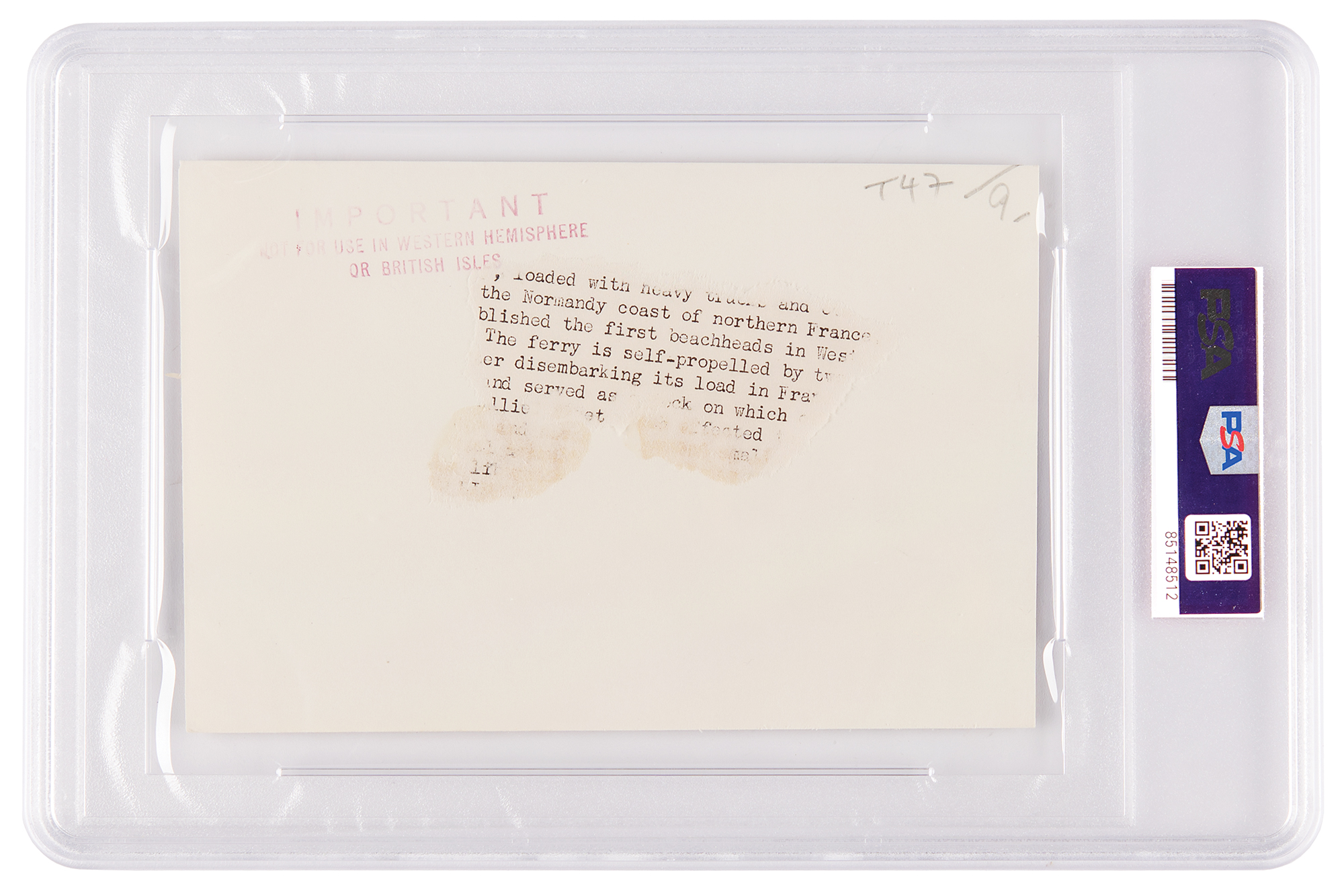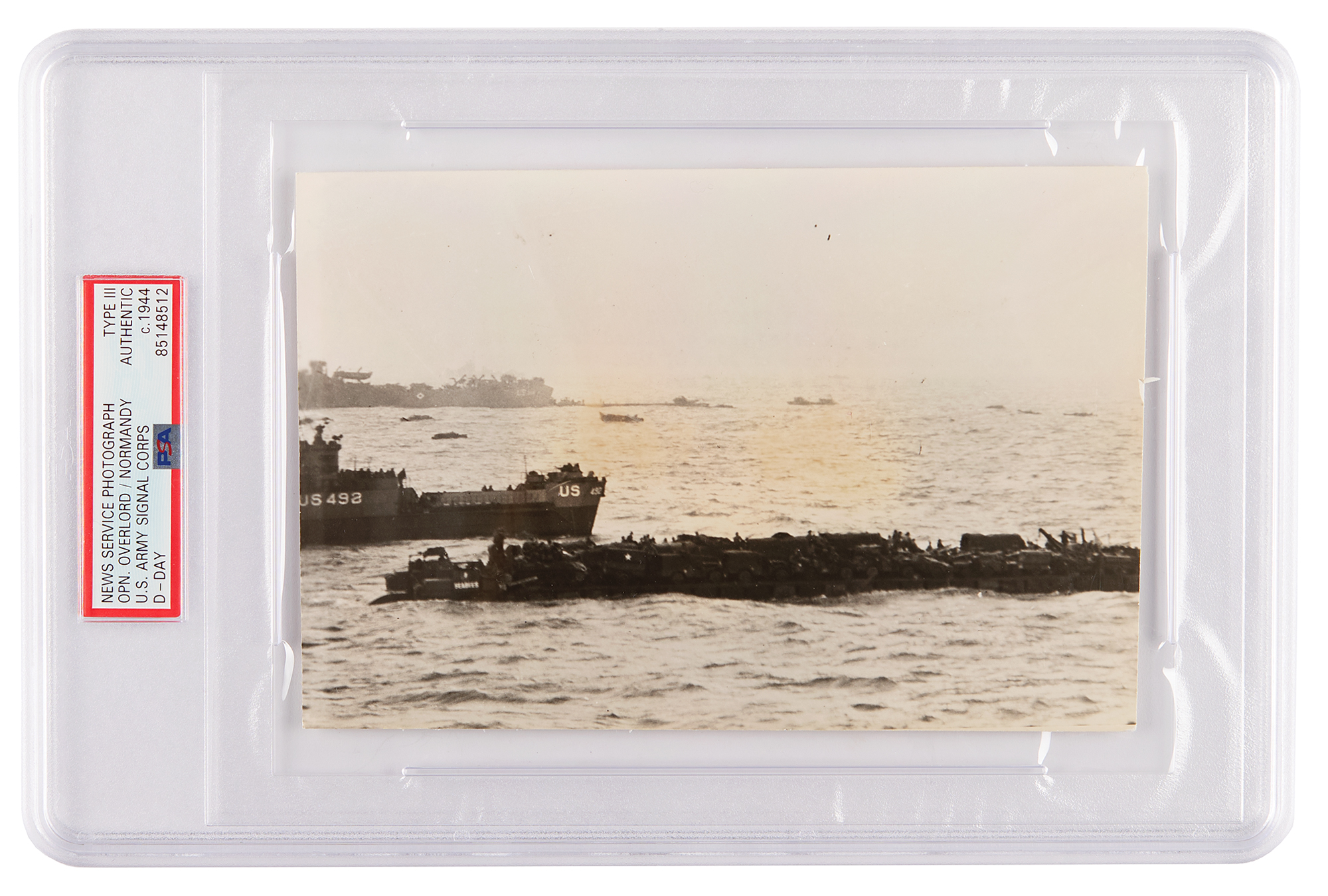Original vintage circa 1944 glossy 6.5 x 4.5 wirephoto of United States Navy landing ships and 'rhino ferry' barges approaching the beachheads of Normandy during Operation Overlord, famously launched on June 6, 1944 (D-Day). Reverse is stamped, "Important: Not for use in Western Hemisphere or British Isles," and retains a partial printed caption identifying the scene. In fine condition, with some discoloration at center from the caption on the reverse. Encapsulated by PSA as an authentic "Type III" photograph, circa 1944.