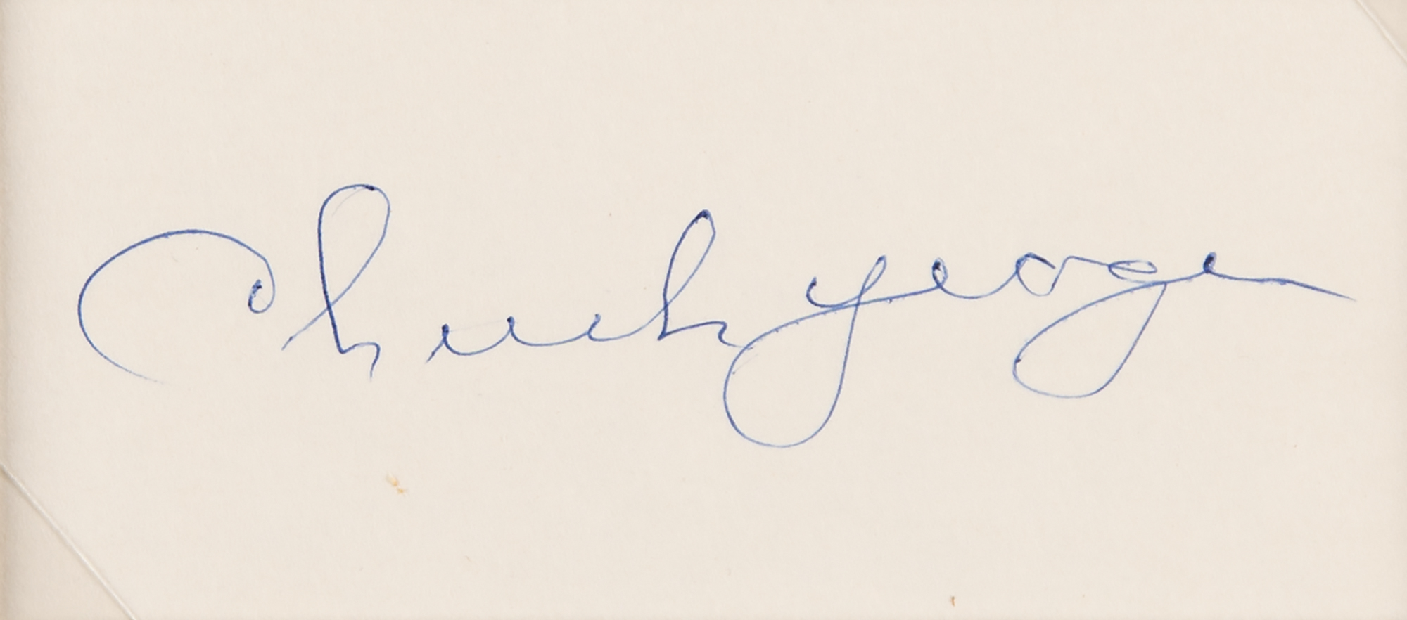 Ballpoint signature, "Chuck Yeager,” on an off-white 4.25 x 2 sheet. Double-matted with a photo of Yeager posing with his Bell X-1 Glamorous Glennis to an overall size of 13.5 x 14.25. In fine condition.