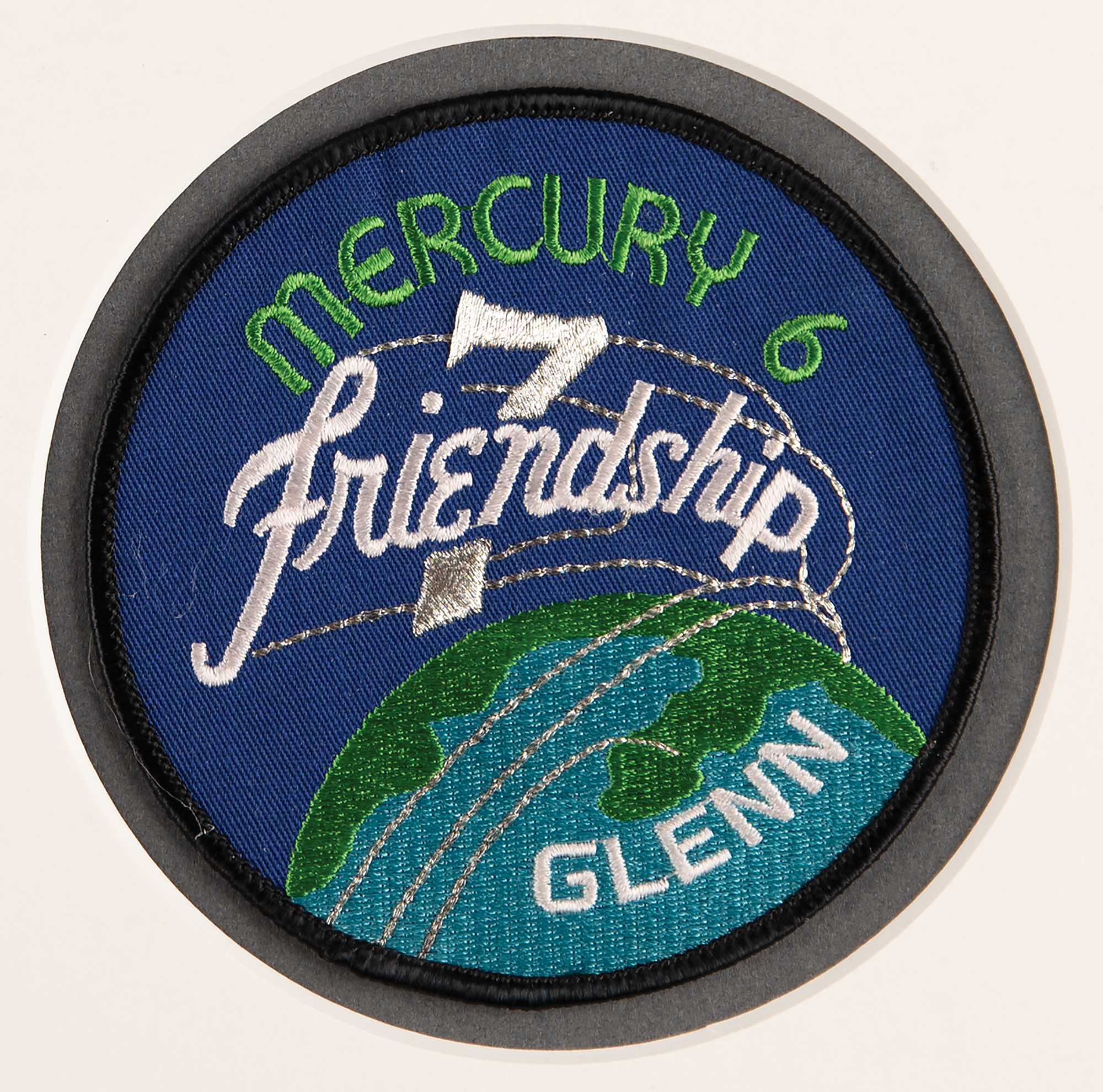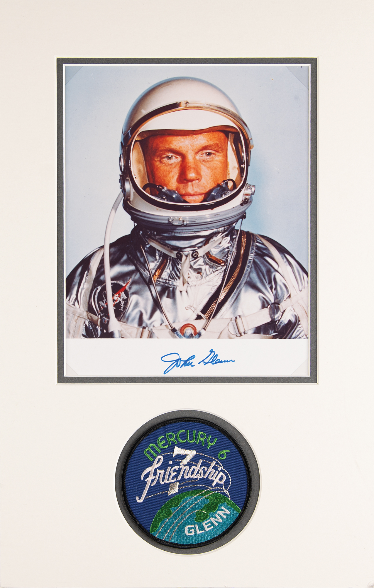 Color semi-glossy 7.5 x 9.5 photo of John Glenn wearing his silver Mercury space suit, signed in the lower border in blue felt tip. Double-matted with an embroidered Friendship 7 mission patch to an overall size of 11.5 x 17.75. In very fine condition.