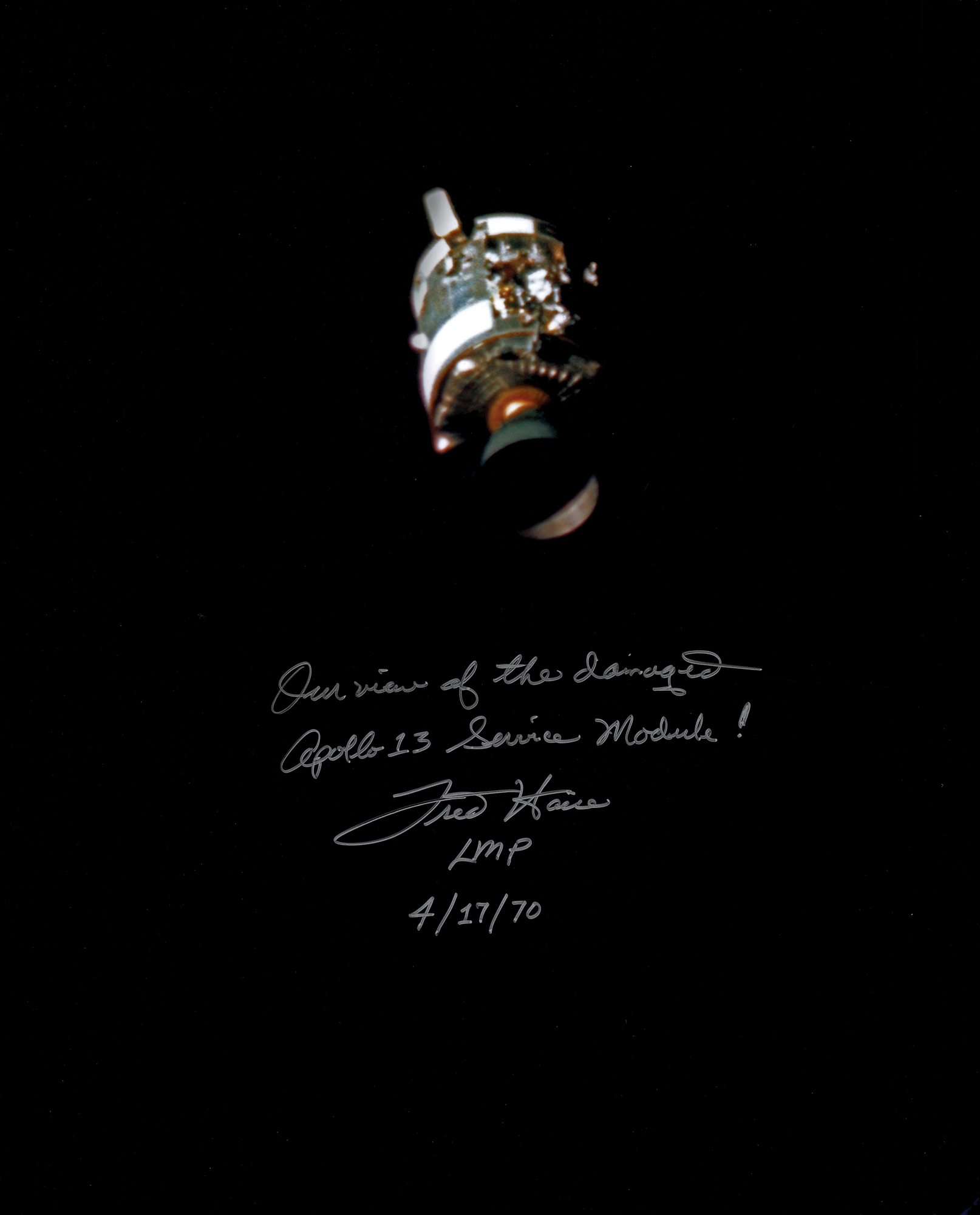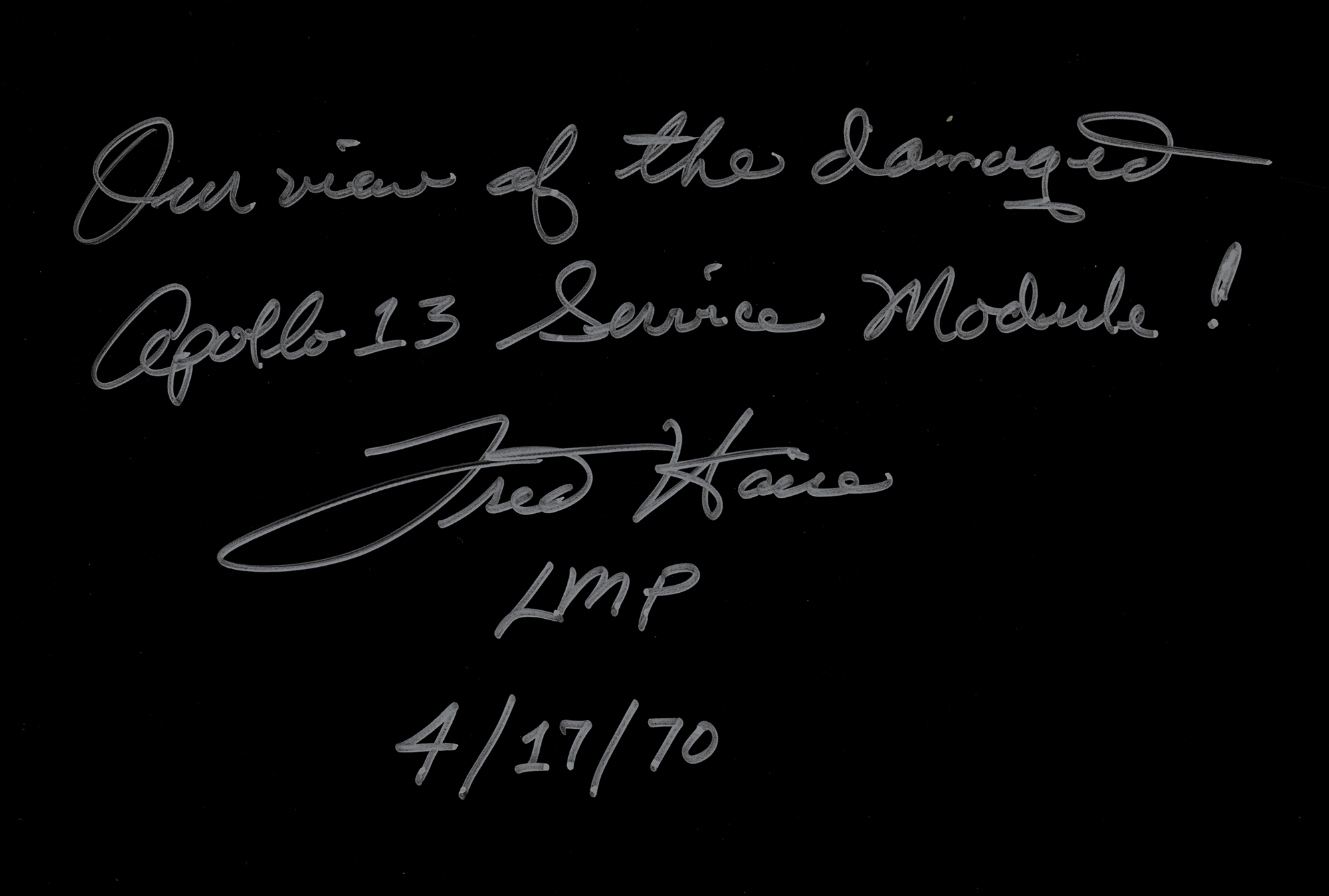 Color satin-finish 16 x 20 photo of the crippled Apollo 13 service module floating in space, signed in silver ink, "Our view of the damaged Apollo 13 Service Module! Fred Haise, LMP, 4/17/70." In fine condition.