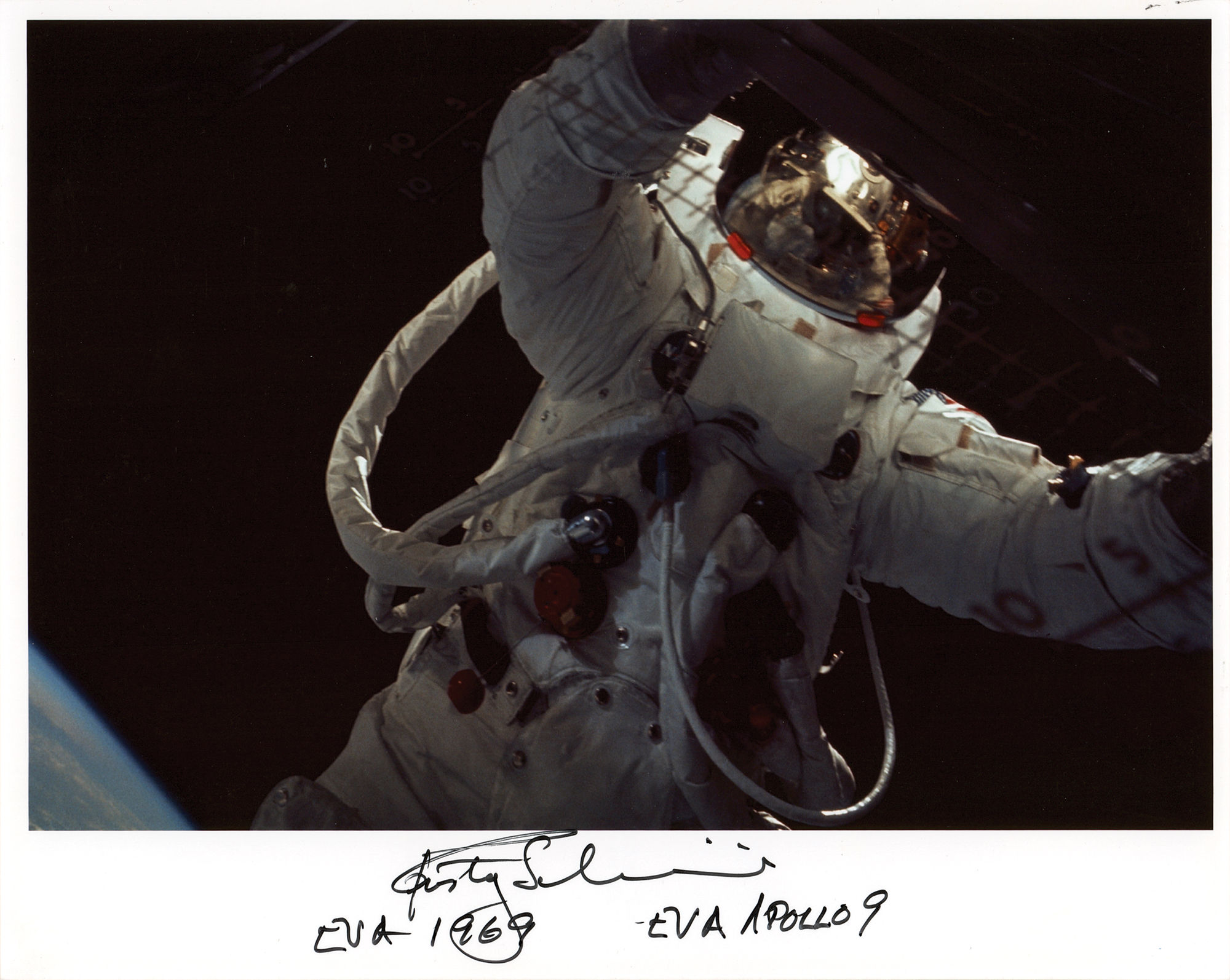 Color satin-finish 10 x 8 photo of Lunar Module Pilot Schweickart performing an EVA during the Apollo 9 mission, signed in the lower border in black felt tip, "Rusty Schweickart, EVA 1969, EVA Apollo 9." In very fine condition.