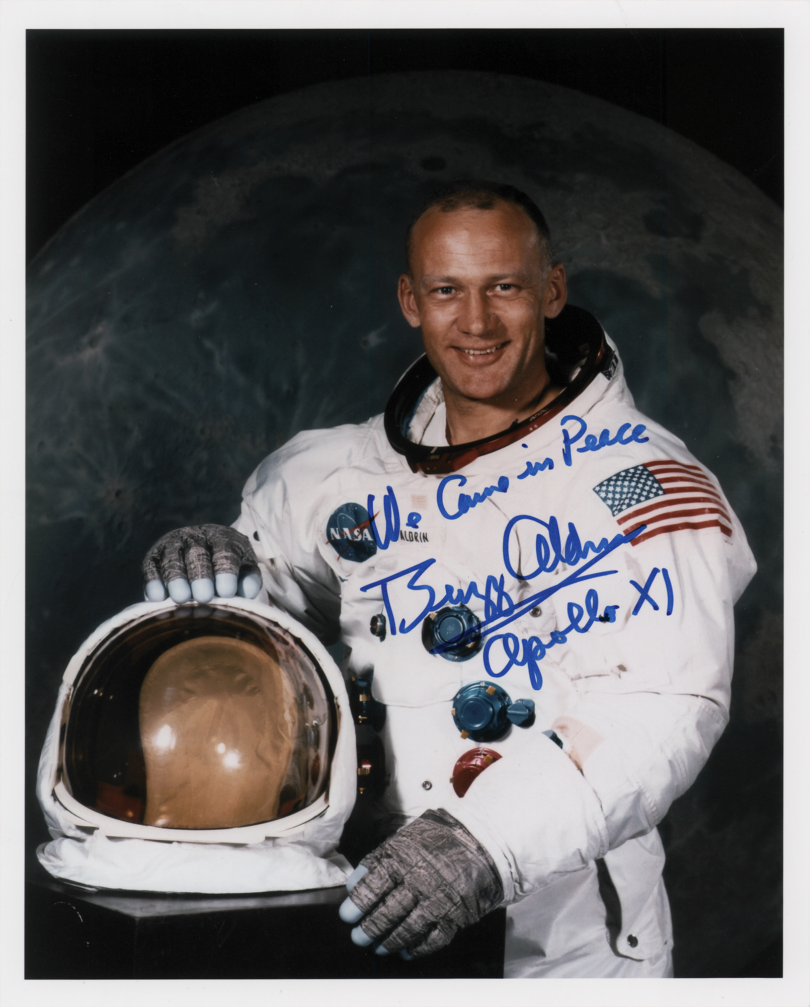 Color satin-finish 8 x 10 photo of Apollo 11 LMP Buzz Aldrin wearing his white space suit against a lunar backdrop, signed in blue felt tip, “We Came in Peace, Buzz Aldrin, Apollo XI.” In very fine condition.