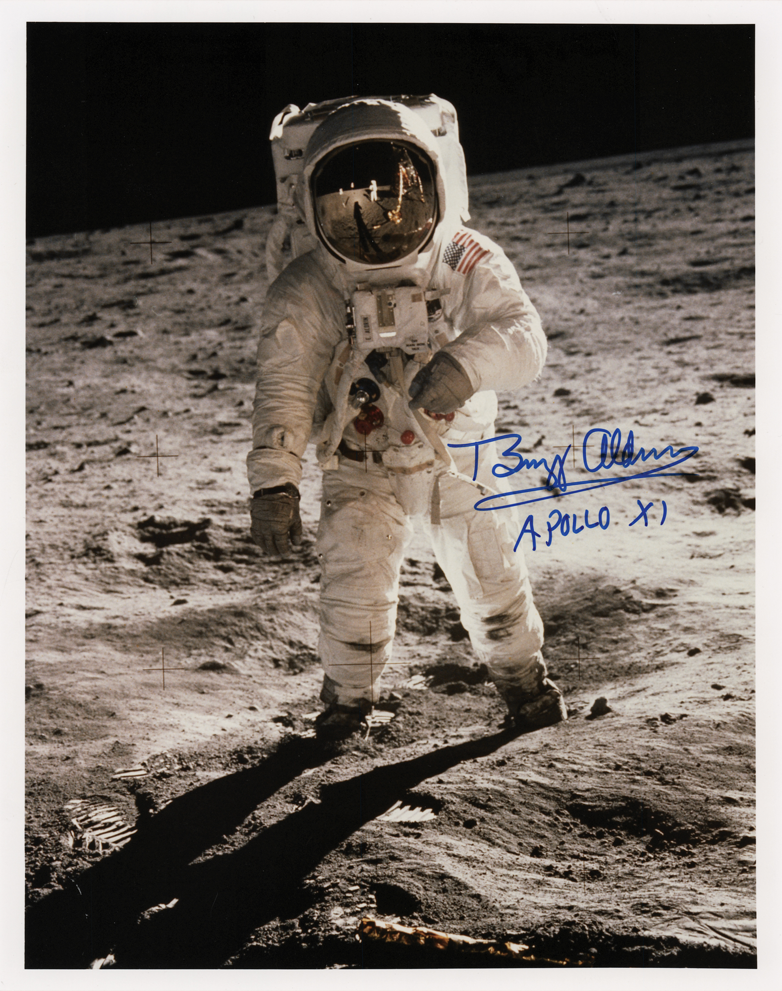 Color semi-glossy 8 x 10 full-length photo of LMP Aldrin standing on the lunar surface, his visor showing a small reflection of the photographer, Neil Armstrong, signed in blue felt tip, "Buzz Aldrin, Apollo XI." In very fine condition.