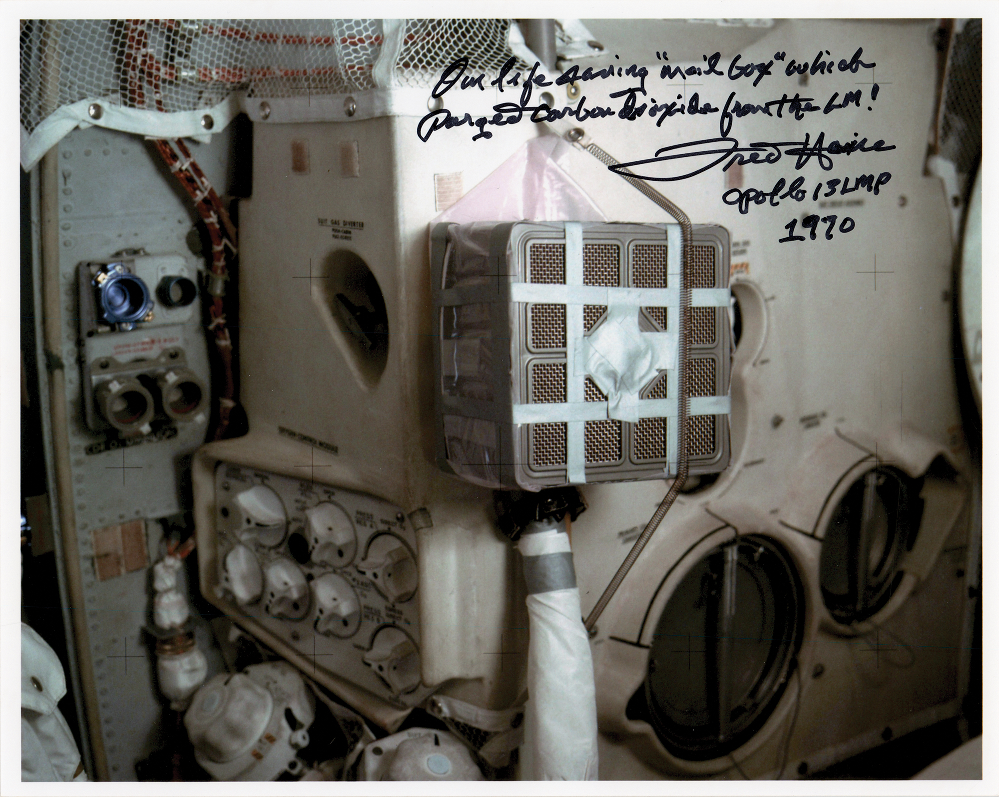Color satin-finish 10 x 8 photo of the essential LiOH canister adapter from the Apollo 13 mission, signed in black felt tip, “Our life saving 'mail box' which purged carbon dioxide from the LM! Fred Haise, Apollo 13 LMP, 1970.” In very fine condition.
