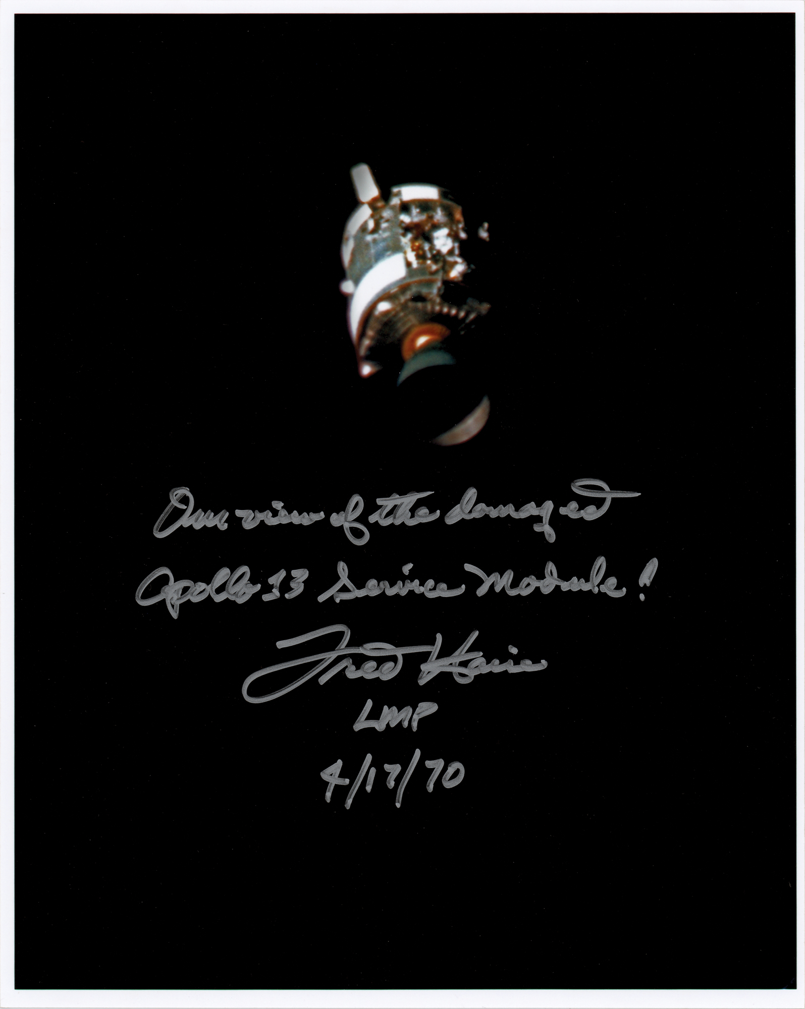 Color satin-finish 8 x 10 photo of the crippled Apollo 13 service module floating in space, signed in silver ink, "Our view of the damaged Apollo 13 Service Module! Fred Haise, LMP, 4/17/70." In very fine condition.